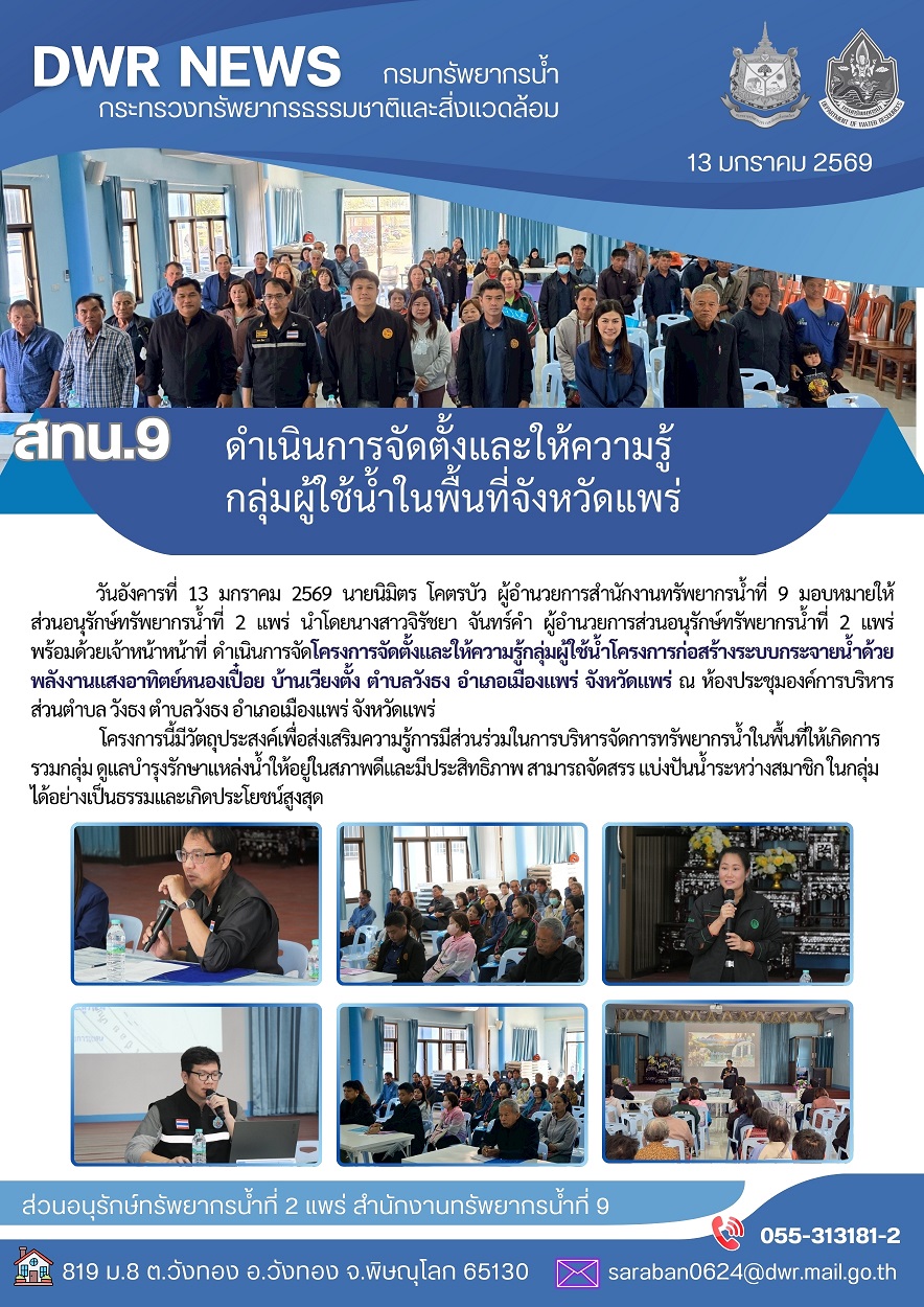 วันจันทร์ที่ 13 มกราคม 2569 นายนิมิตร โคตรบัว ผู้อำนวยการสำนักงานทรัพยากรน้ำที่ 9 มอบหมายให้ส่วนอนุรักษ์ทรัพยากรน้ำที่ 2 แพร่ นำโดยนางสาวจิรัชยา จันทร์คำ ผู้อำนวยการส่วนอนุรักษ์ทรัพยากรน้ำที่ 2 แพร่ พร้อมด้วยเจ้าหน้าหน้าที่ ดำเนินการจัดโครงการจัดตั้งและให้ความรู้กลุ่มผู้ใช้น้ำ โครงการก่อสร้างระบบกระจายน้ำด้วยพลังงานแสงอาทิตย์หนองเปื๋อย บ้านเวียงตั้ง ตำบลวังธง อำเภอเมืองแพร่ จังหวัดแพร่ ณ ห้องประชุมองค์การบริหารส่วนตำบลวังธง ตำบลวังธง อำเภอเมืองแพร่ จังหวัดแพร่