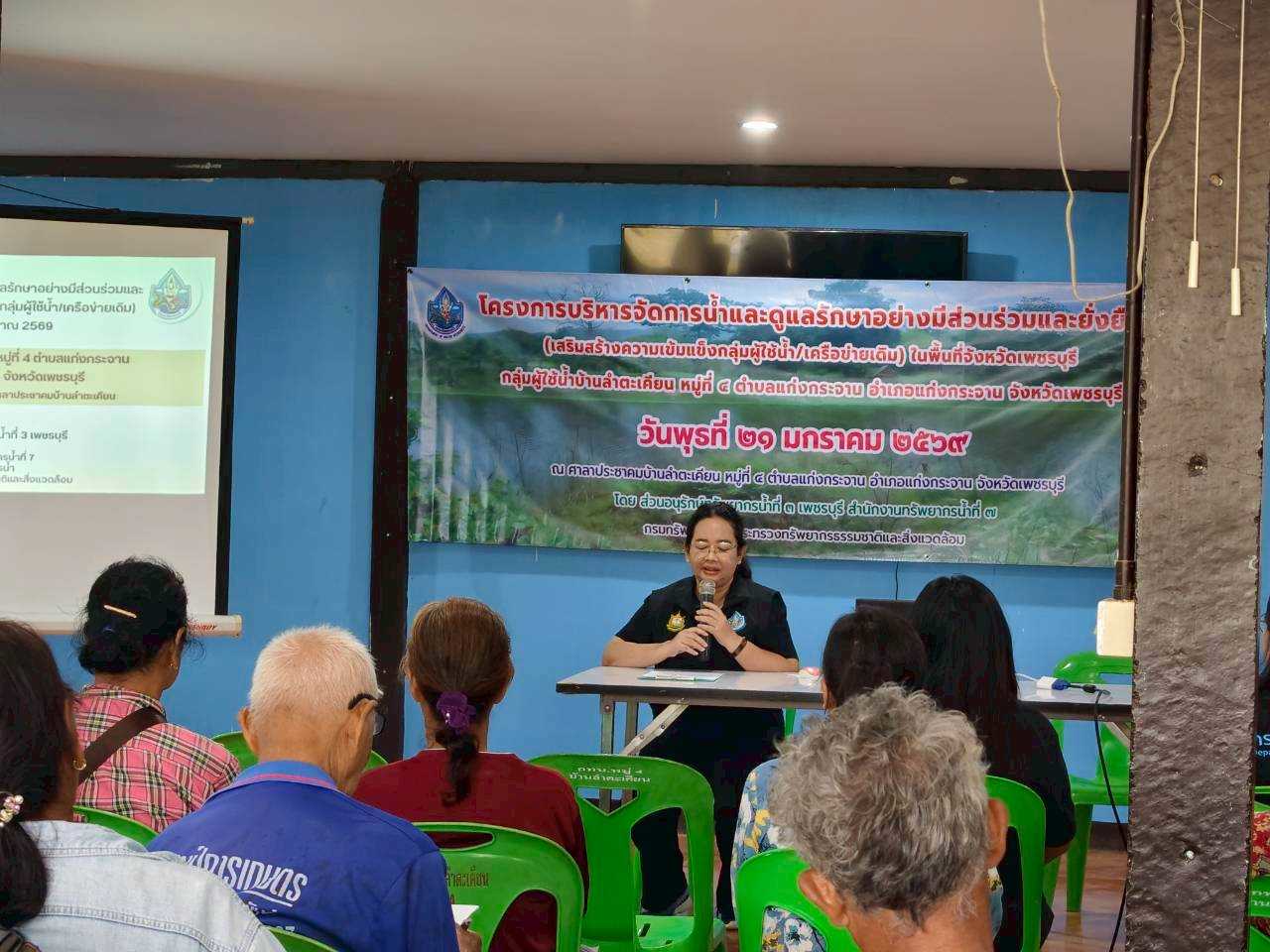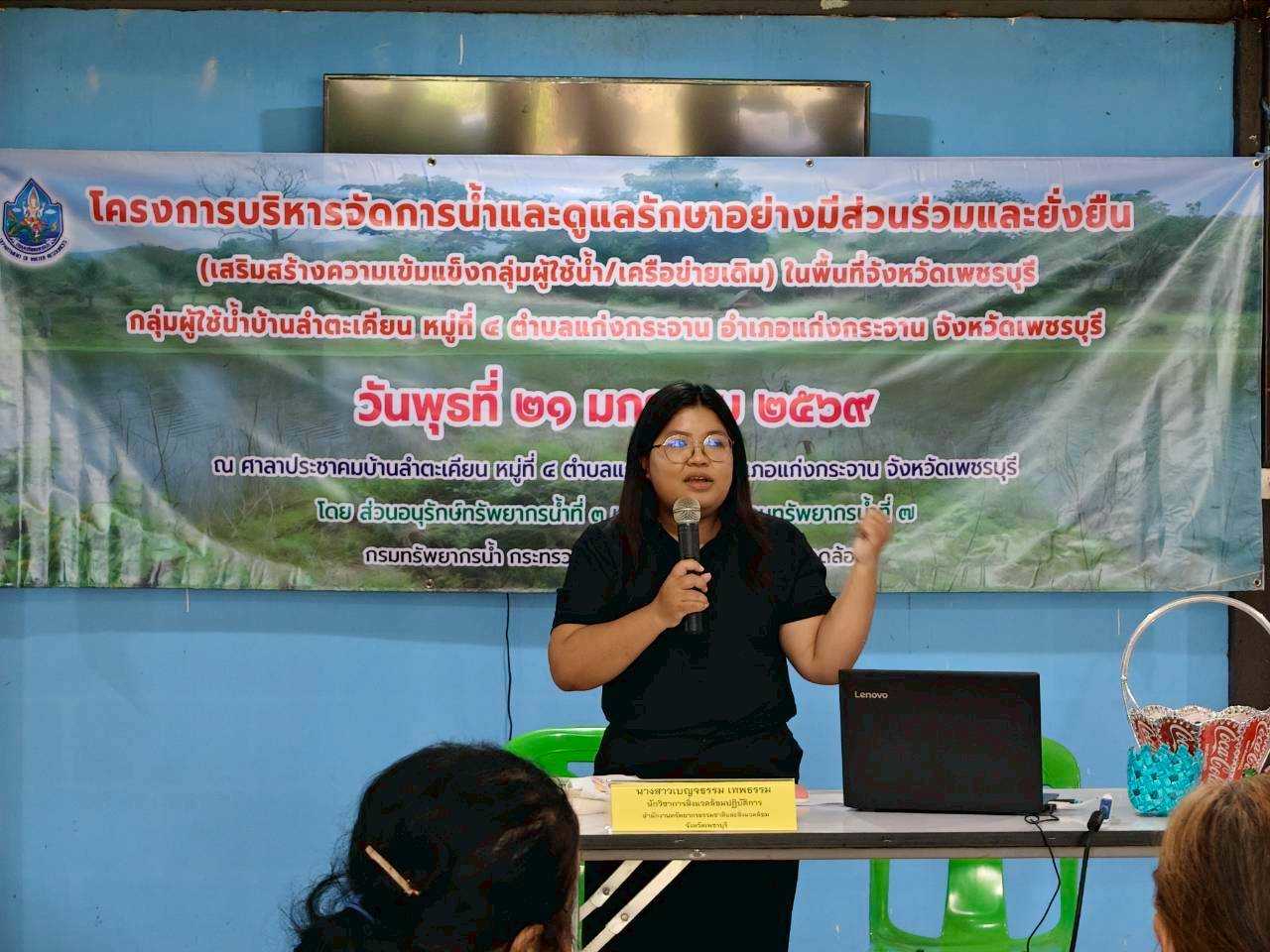 วันที่ 21 มกราคม 2569 นายอนันต์ โพธิ์พันธุ์ ผู้อำนวยการสำนักงานทรัพยากรน้ำที่ 7 มอบหมายให้ส่วนอนุรักษ์ทรัพยากรน้ำที่ 3 เพชรบุรี ดำเนินการจัดโครงการบริหารจัดการน้ำและดูแลรักษาอย่างมีส่วนร่วมและยั่งยืน (เสริมสร้างความเข้มแข็งกลุ่มผู้ใช้น้ำ/เครือข่ายเดิม) กลุ่มผู้ใช้น้ำบ้านลำตะเคียน หมู่ที่ 4 ตำบลแก่งกระจาน อำเภอแก่งกระจาน จังหวัดเพชรบุรี ณ ศาลาประชาคมบ้านลำตะเคียน หมู่ที่ 4 ตำบลแก่งกระจาน อำเภอแก่งกระจาน จังหวัดเพชรบุรี เพื่อส่งเสริมให้ความรู้เกี่ยวกับการใช้สารอินทรีย์ชีวภาพในการทำการเกษตร การจัดการขยะเพื่อลดมลพิษต่อสิ่งแวดล้อม การดูแลรักษาแหล่งน้ำ การมีส่วนร่วมในการบริหารจัดการทรัพยากรน้ำ และผลักดันสู่องค์กรผู้ใช้น้ำ ผู้เข้าร่วมโครงการ ประกอบด้วย ผู้แทนองค์การบริหารส่วนตำบลแก่งกระจาน ผู้นำชุมชน ประชาชนในพื้นที่ และสมาชิกกลุ่มผู้ใช้น้ำบ้านลำตะเคียน รวมทั้งสิ้น 66 คน
