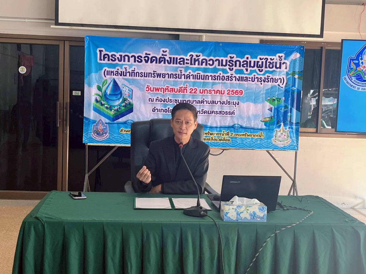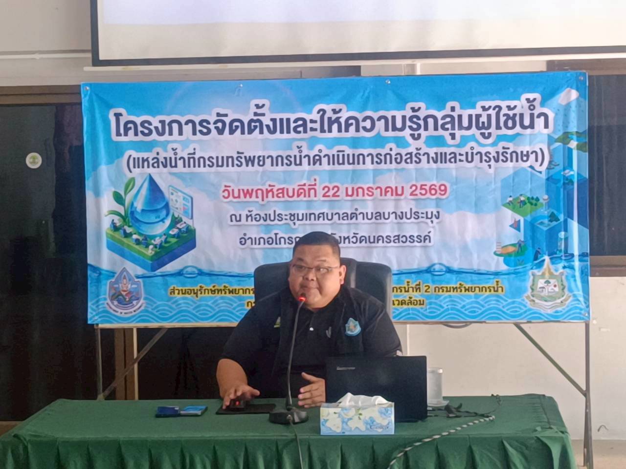 นายสิทธิชัย ปริญญาขจร ผู้อำนวยการสำนักงานทรัพยากรน้ำที่ 2 มอบหมายให้นายบุรุษรัตน์ นาวิก ผู้อำนวยการส่วนอนุรักษ์ทรัพยากรน้ำที่ 2 อุทัยธานี พร้อมด้วยเจ้าหน้าที่ดำเนินการโครงการจัดตั้งและให้ความรู้กลุ่มผู้ใช้น้ำ (แหล่งน้ำที่กรมทรัพยากรน้ำ ดำเนินการก่อสร้างและบำรุงรักษา) ณ ห้องประชุมเทศบาลตำบลบางประมุง อำเภอโกรกพระ จังหวัดนครสวรรค์ โดยมีผู้เข้าร่วมโครงการ จำนวน 56 คน เพื่อส่งเสริมให้ประชาชนและผู้มีส่วนได้ส่วนเสียในพื้นที่มีความรู้ความเข้าใจและมีส่วนร่วม ในการบริหารจัดการทรัพยากรน้ำอย่างเป็นระบบและยั่งยืน โดยมุ่งพัฒนาศักยภาพกลุ่มผู้ใช้น้ำให้สามารถวางแผนใช้น้ำ บำรุงรักษาและแก้ไขปัญหาการใช้น้ำร่วมกันได้อย่างมีประสิทธิภาพ ลดความขัดแย้ง เสริมสร้างความเข้มแข็งขององค์กรชุมชน และสนับสนุนการบริหารจัดการน้ำ ตามแนวทางการมีส่วนร่วมของทุกภาคส่วนในระดับพื้นที่ โดยมีนายอติเทพ ธัญญกสิกล นายกเทศมนตรีตำบลบางประมุง เป็นประธานกล่าวเปิดโครงการฯ