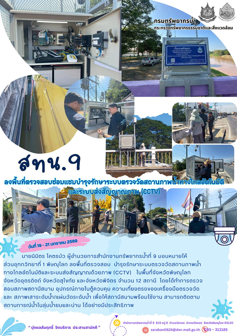 นายนิมิตร โคตรบัว ผู้อำนวยการสำนักงานทรัพยากรน้ำที่ 9 มอบหมายให้ ส่วนอุทกวิทยาที่ 1 พิษณุโลก ลงพื้นที่ตรวจสอบ บำรุงรักษาระบบตรวจวัดสถานภาพน้ำทางไกลอัตโนมัติและระบบส่งสัญญาณด้วยภาพ (CCTV) ในพื้นที่จังหวัดพิษณุโลก จังหวัดอุตรดิตถ์ จังหวัดสุโขทัย และจังหวัดพิจิตร จำนวน 12 สถานี โดยได้ทำการตรวจสอบสภาพสถานีสนาม อุปกรณ์ภายในตู้ควบคุม ความเที่ยงตรงของเครื่องมือตรวจวัดและ สภาพเสาระดับน้ำ/แผ่นวัดระดับน้ำ เพื่อให้สถานีสนามพร้อมใช้งาน สามารถติดตามสถานการณ์น้ำในลุ่มน้ำยมและน่าน ได้อย่างมีประสิทธิภาพ