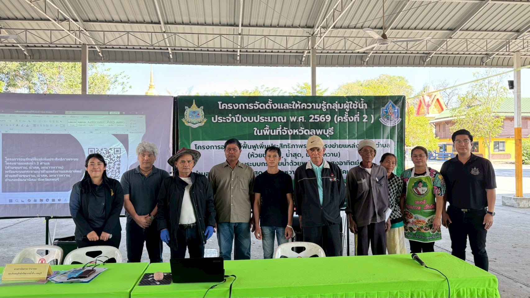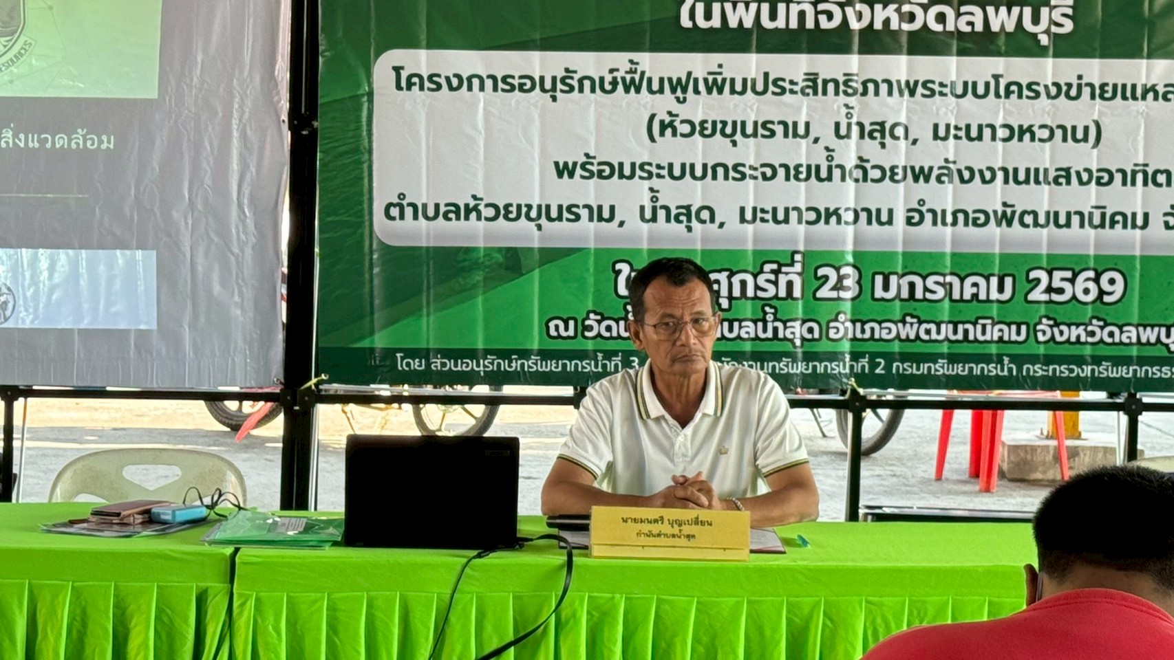 สำนักงานทรัพยากรน้ำที่ 2 โดยส่วนอนุรักษ์ทรัพยากรน้ำที่ 3 ลพบุรี ดำเนินการจัดตั้งและให้ความรู้กลุ่มผู้ใช้น้ำโครงการอนุรักษ์ฟื้นฟูเพิ่มประสิทธิภาพระบบโครงข่ายแหล่งน้ำ 3 ตำบล (ห้วยขุนราม, น้ำสุด, มะนาวหวาน) พร้อมระบบกระจายน้ำด้วยพลังงานแสงอาทิตย์ ตำบลห้วยขุนราม, น้ำสุด, มะนาวหวาน อำเภอพัฒนานิคม จังหวัดลพบุรี ณ วัดน้ำสุด ตำบลน้ำสุด อำเภอพัฒนานิคม จังหวัดลพบุรีเพื่อให้ประชาชนในพื้นที่โครงการมีส่วนร่วมในการบริหารจัดการอนุรักษ์ พัฒนาแหล่งน้ำและทรัพยากรน้ำ รับทราบข้อมูล ข้อคิดเห็น และเสริมสร้างศักยภาพให้ประชาชนผู้ใช้น้ำจากแหล่งน้ำของกรมทรัพยากรน้ำ มีความรู้ความเข้าใจเกี่ยวกับการบริหารจัดการทรัพยากรน้ำแบบบูรณาการ การอนุรักษ์ ฟื้นฟูทรัพยากรน้ำ และทรัพยากรอื่นๆ ที่เกี่ยวข้อง รวมถึงส่งเสริมให้มีการจัดตั้งกลุ่มผู้ใช้น้ำ/เครือข่าย เพื่อการบริหารจัดการทรัพยากรน้ำ