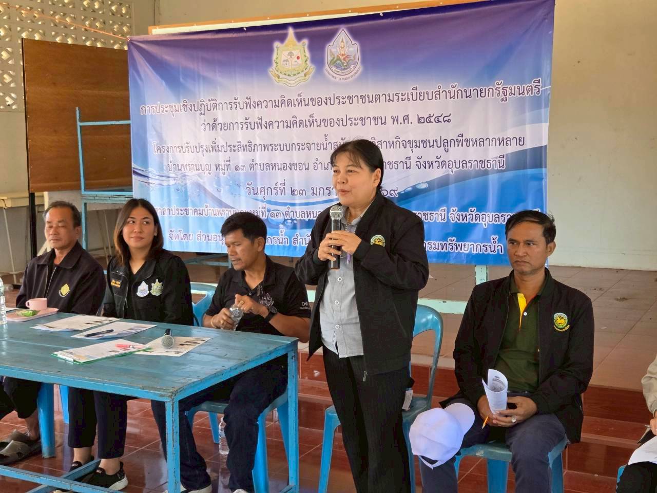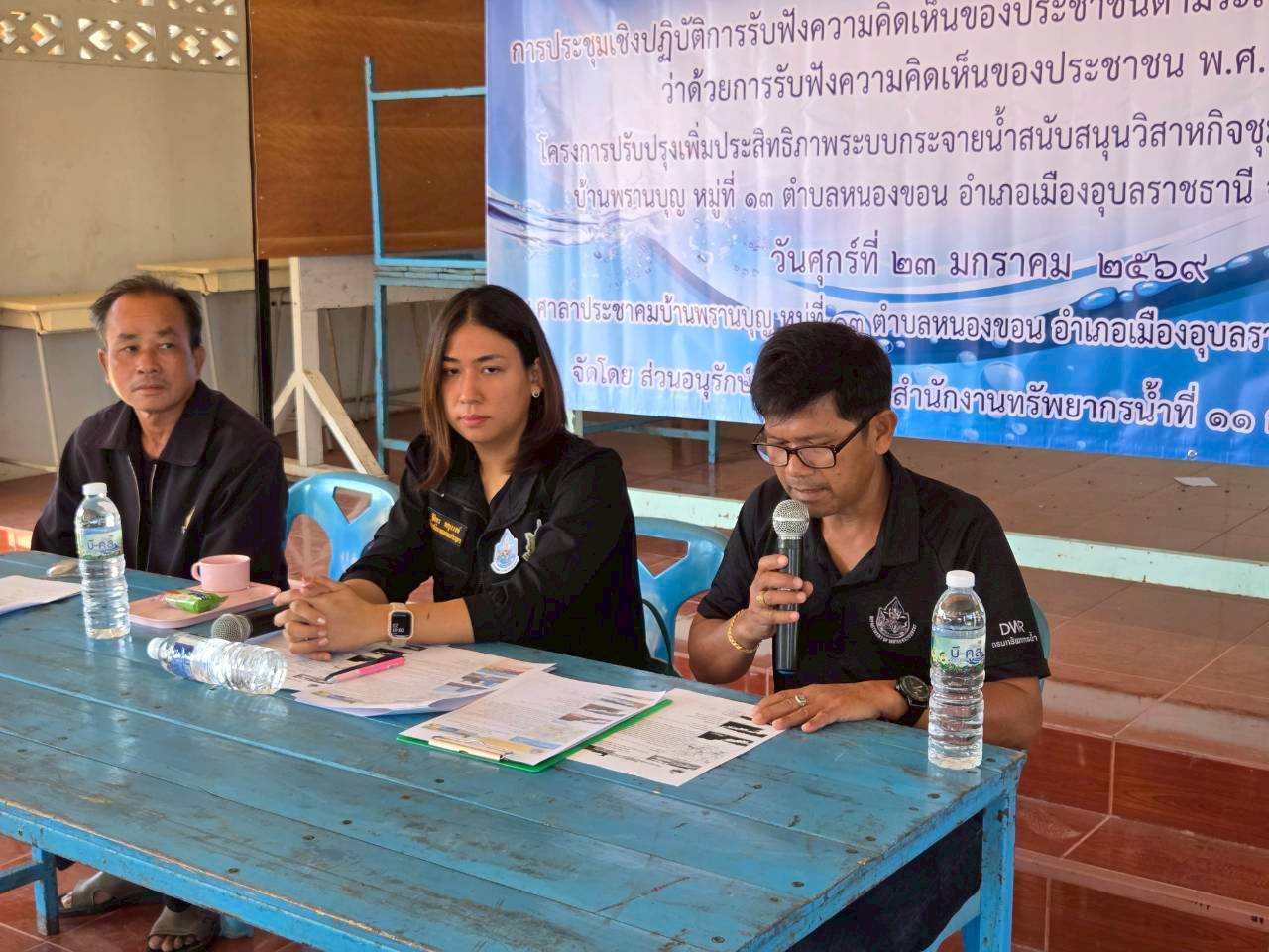23 มกราคม 2569 นายโภคิน ช้ำเกตุ ผู้อำนวยการสำนักงานทรัพยากรน้ำที่ 11 มอบหมายให้ เจ้าหน้าที่ส่วนอนุรักษ์ทรัพยากรน้ำลงพื้นที่ จ.อุบลราชธานี เพื่อจัดประชุมเชิงปฏิบัติการรับฟัง ความคิดเห็นของประชาชนตามระเบียบสำนักนายกรัฐมนตรีว่าด้วยการรับฟังความคิดเห็น ของประชาชน พ.ศ. 2548 จำนวน 2 โครงการ ดังนี้ 1) “โครงการปรับปรุงเพิ่มประสิทธิภาพระบบ กระจายน้ำสนับสนุนวิสาหกิจชุมชนปลูกพืชหลากหลาย” บ.พรานบุญ ม. 13 ต.หนองขอน อ.เมือง อุบลราชธานี จ.อุบลราชธานี ณ ศาลาประชาคม บ.พรานบุญ ม. 13 มีประชาชนเข้าร่วมโครงการฯ จำนวน 40 ราย เเละ 2) “โครงการปรับปรุงเพิ่มประสิทธิภาพแหล่งน้ำฝายห้วยผับ เพื่อการถ่ายโอน ให้องค์กรปกครองส่วนท้องถิ่น” บ.ท่าหลวง ม. 6 ต.คูเมือง อ.วารินชำราบ จ.อุบลราชธานี ณ ศาลา ประชาคม บ.ท่าหลวง ม. 6 มีประชาชนเข้าร่วมโครงการฯ จำนวน 28 ราย ทั้งนี้ มีการชี้แจง รายละเอียดเกี่ยวกับโครงการของกรมทรัพยากรน้ำที่จะดำเนินการในพื้นที่ ซึ่งที่ประชุมฯ มีมติ เห็นชอบให้ดำเนินการโครงการฯ และให้ข้อคิดเห็นข้อเสนอแนะที่เป็นประโยชน์ โดยสำนักงาน ทรัพยากรน้ำที่ 11 จะนำข้อเสนอแนะและความต้องการของที่ประชุมไปพิจารณาดำเนินการ เพื่อขอรับการสนับสนุนงบประมาณการก่อสร้างโครงการต่อไป