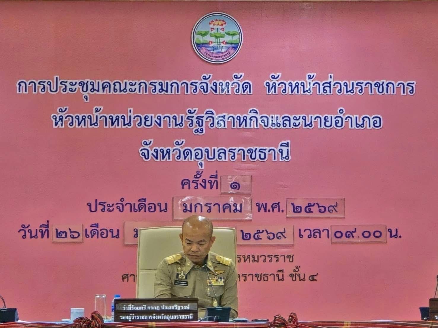 วันที่ 26 มกราคม 2569 นายโภคิน ช้ำเกตุ ผู้อำนวยการสำนักงานทรัพยากรน้ำที่ 11 มอบหมายให้ นางสาวกฤติยา ตุ้มทอง ผู้อำนวยการส่วนอำนวยการ เข้าร่วมประชุม คณะกรมการจังหวัดอุบลราชธานี หัวหน้าส่วนราชการ หัวหน้าหน่วยงานรัฐวิสาหกิจ และนายอำเภอ ครั้งที่ 1/2569 ประจำเดือนมกราคม 2569 เพื่อทราบเเละพิจารณาระเบียบวาระข้อราชการ ในประเด็นที่สำคัญ ได้แก่ ประเด็นด้านความมั่นคง, ด้านเศรษฐกิจ, ด้านสังคมเเละด้านกิจการพิเศษ โดยมี ว่าที่ร้อยตรีกรกฏ ประเสริฐวงษ์ รองผู้ว่าราชการจังหวัดอุบลราชธานี เป็นประธาน ณ ห้องประชุมพรหมวรราช ชั้น 4 ศาลากลางจังหวัดอุบลราชธานี