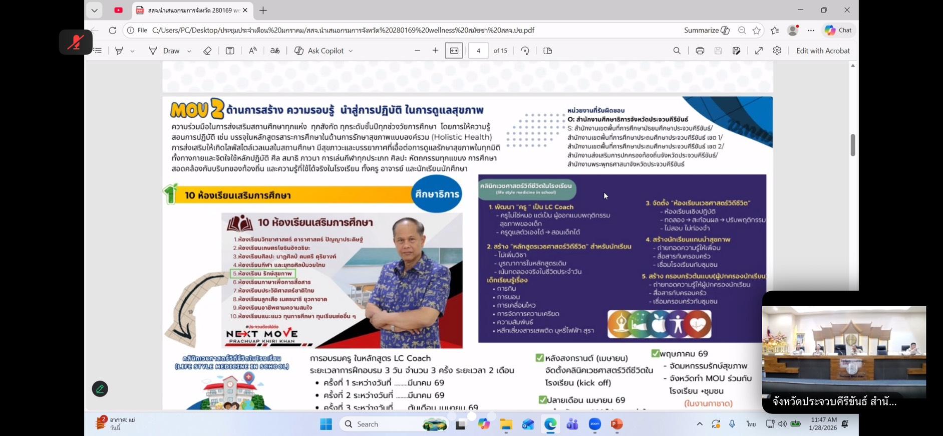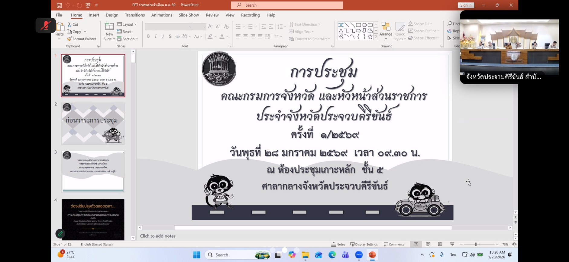 วันที่ 28 มกราคม 2569 นายอนันต์ โพธิ์พันธุ์ ผู้อำนวยการสำนักงานทรัพยากรน้ำที่ 7 มอบหมายให้ส่วนอนุรักษ์ทรัพยากรน้ำที่ 3 เพชรบุรี เข้าร่วมประชุมคณะกรมการจังหวัดและหัวหน้าส่วนราชการประจำจังหวัดประจวบคีรีขันธ์ ประจำเดือนมกราคม 2569 ครั้งที่ 1/2569 ผ่านระบบทางไกลออนไลน์ (Zoom Meeting) โดยมีนายสิทธิชัย สวัสดิ์แสน ผู้ว่าราชการจังหวัดประจวบคีรีขันธ์ เป็นประธานการประชุม ทั้งนี้ เพื่อแจ้งข้อมูลข่าวสาร ติดตามความก้าวหน้าและรับทราบผลการดำเนินงานของหน่วยงานราชการที่เกี่ยวข้อง