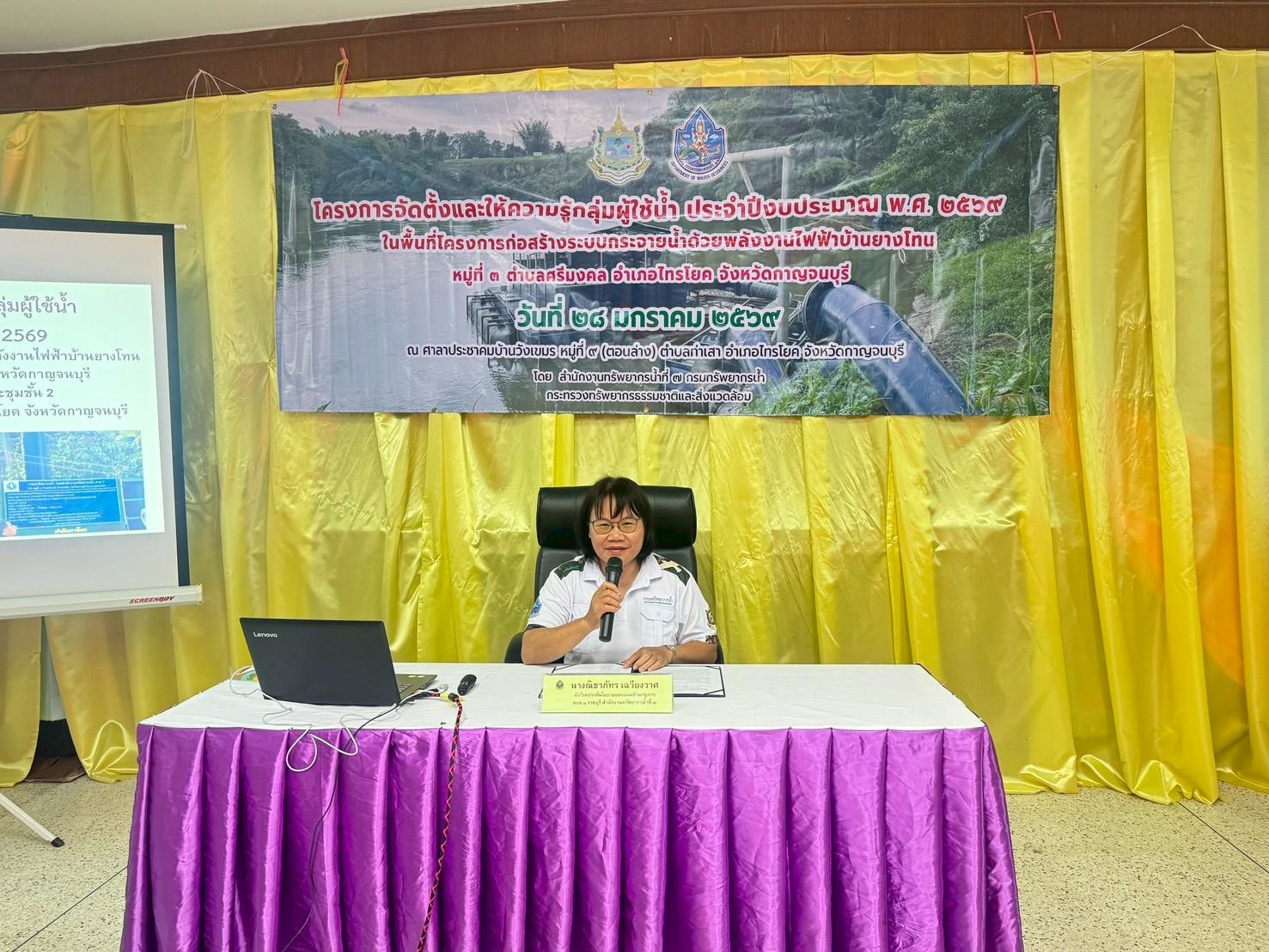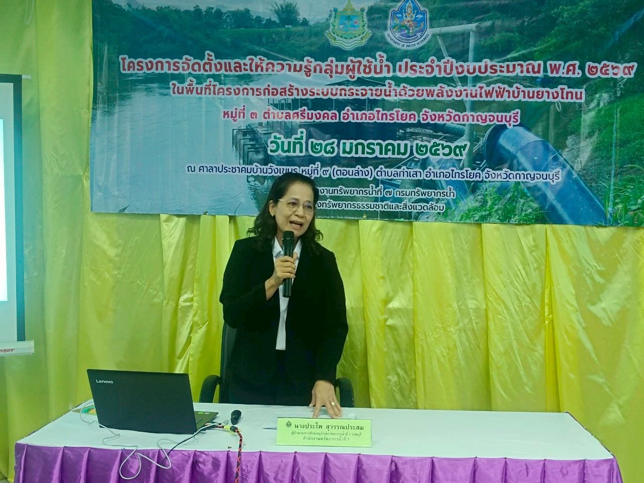 วันที่ 28 มกราคม 2569 นายอนันต์ โพธิ์พันธุ์ ผู้อำนวยการสำนักงานทรัพยากรน้ำที่ 7 มอบหมายให้ส่วนอนุรักษ์ทรัพยากรน้ำที่ 1 ราชบุรี จัดประชุมโครงการจัดตั้งและให้ความรู้กลุ่มผู้ใช้น้ำ ประจำปีงบประมาณ พ.ศ.2569 ในพื้นที่โครงการก่อสร้างระบบกระจายน้ำด้วยพลังงานไฟฟ้าบ้านยางโทน หมู่ที่ 3 ตำบลศรีมงคล อำเภอไทรโยค จังหวัดกาญจนบุรี ณ ห้องประชุมชั้น 2 องค์การบริหารส่วนตำบลศรีมงคล โดยมีนายอนวัช เพชรวิโรจน์ ปลัดองค์การบริหารส่วนตำบลศรีมงคล เป็นประธานในพิธีเปิด โอกาสนี้ ได้เสริมสร้างความรู้ความเข้าใจเกี่ยวกับระบบกระจายน้ำ การดูแลบำรุงรักษาแหล่งน้ำ การใช้ประโยชน์ร่วมกันและความรู้เกี่ยวกับการจัดตั้งกลุ่มผู้ใช้น้ำ โดยกระบวนการมีส่วนร่วม ผู้เข้าร่วมประชุมประกอบด้วยผู้นำท้องถิ่น ผู้นำท้องที่ และผู้ใช้ประโยชน์จากแหล่งน้ำโครงการฯ จำนวน 42 คน
