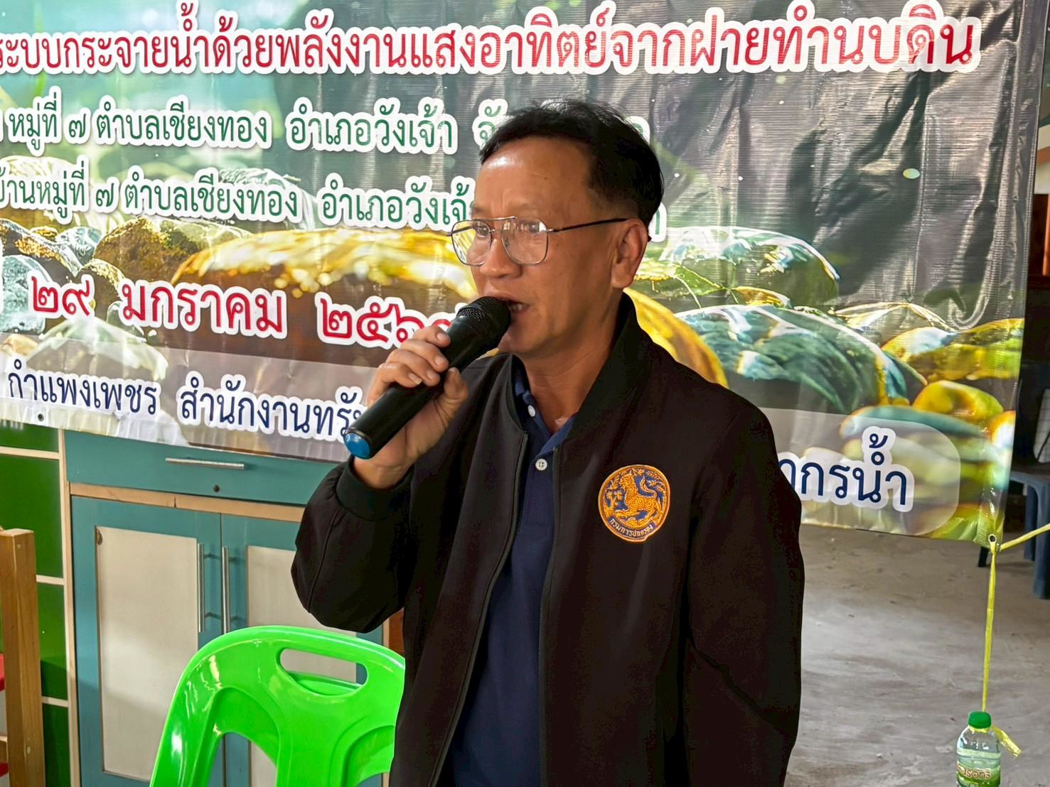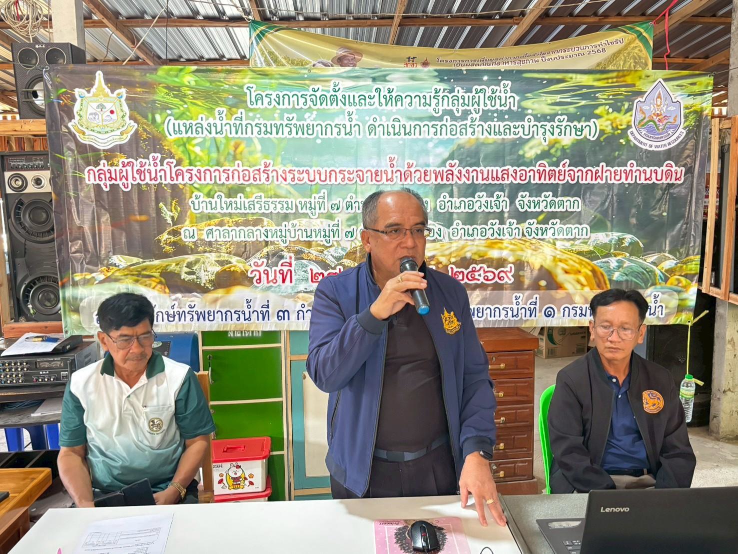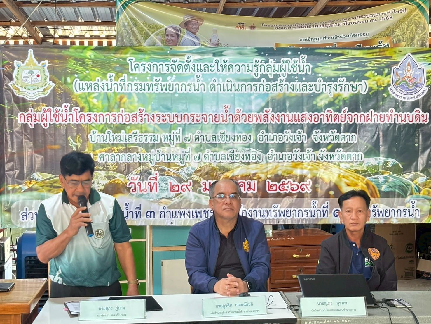 นางสาวสุพัดสอน สีมืด ผู้อำนวยการสำนักงานทรัพยากรน้ำที่ 1 มอบหมายให้ ส่วนอนุรักษ์ทรัพยากรน้ำที่ 3 กำแพงเพชร ดำเนินการจัดกิจกรรมจัดตั้งและให้ความรู้กลุ่มผู้ใช้น้ำ (แหล่งน้ำที่กรมทรัพยากรน้ำ ดำเนินการก่อสร้างและบำรุงรักษา) กลุ่มผู้ใช้น้ำโครงการก่อสร้างกระจายน้ำด้วยพลังงานแสงอาทิตย์จากฝายทำนบดินบ้านใหม่เสรีธรรม หมู่ที่ 7 บ้านใหม่เสรีธรรม ตำบลเชียงทอง อำเภอวังเจ้า จังหวัดตาก ณ ศาลากลางหมู่บ้านใหม่เสรีธรรม หมู่ที่ 7 ตำบลเชียงทอง อำเภอวังเจ้า จังหวัดตาก ผู้เข้าร่วมโครงการประกอบด้วยประชาชนในพื้นที่ สมาชิกกลุ่มผู้ใช้น้ำ จำนวน 42 คนโดยมี นายสุภร ภู่นาคประธานสภาองค์การบริหารส่วนตำบลเชียงทอง เป็นประธานฯ โดยมีวัตถุประสงค์ เพื่อจัดตั้งกลุ่มผู้ใช้น้ำในพื้นที่โครงการอนุรักษ์ ฟื้นฟู พัฒนาแหล่งน้ำพร้อมระบบกระจายน้ำที่กรมทรัพยากรน้ำสร้างขึ้น และส่งเสริมการมีส่วนร่วม ในการบริหารจัดการทรัพยากรน้ำในพื้นที่และร่วมกันดูแลบำรุงรักษาแหล่งน้ำ