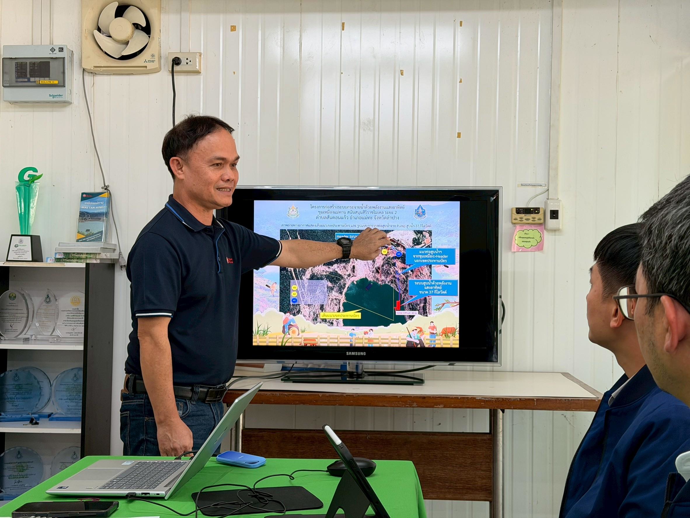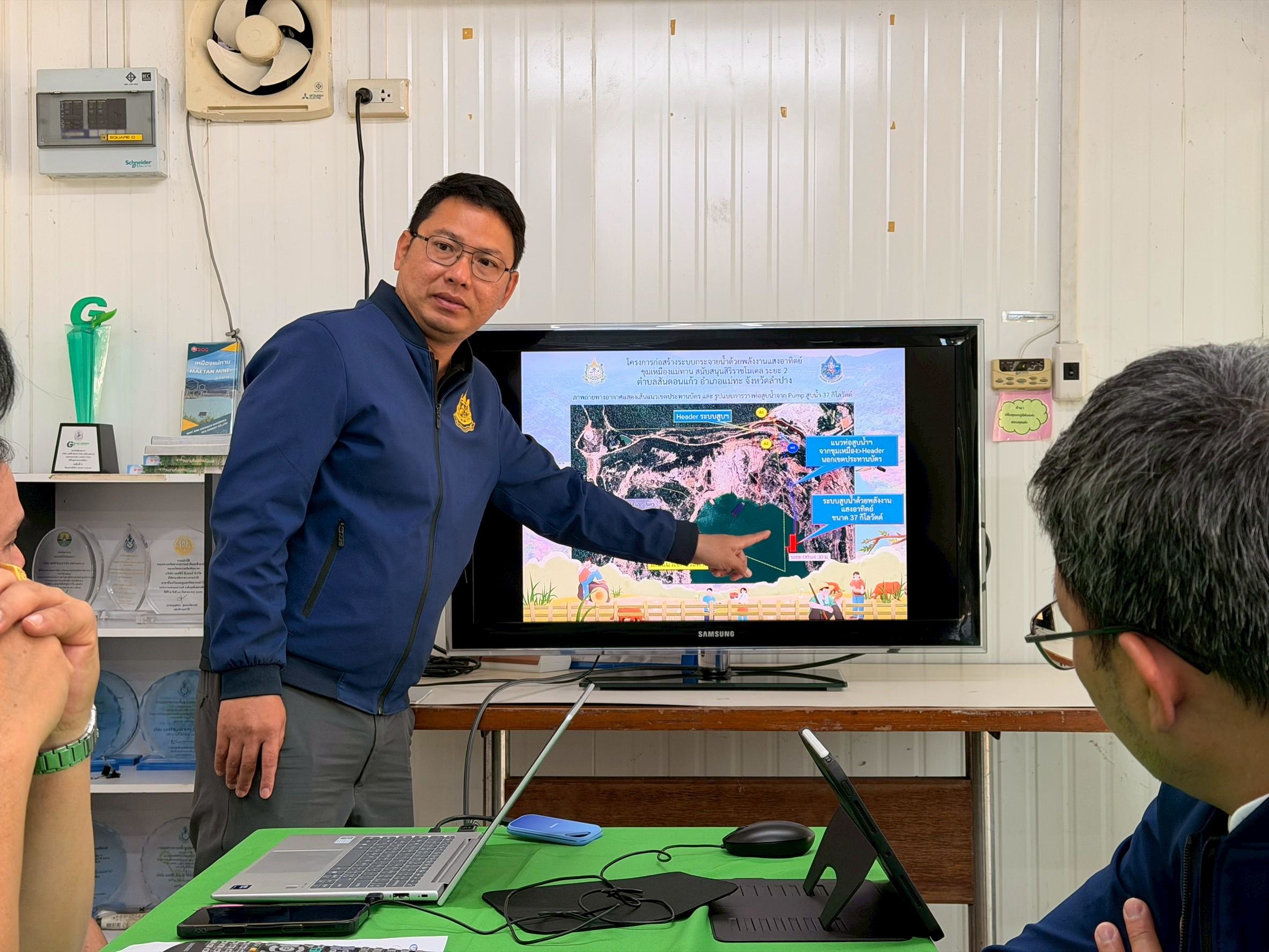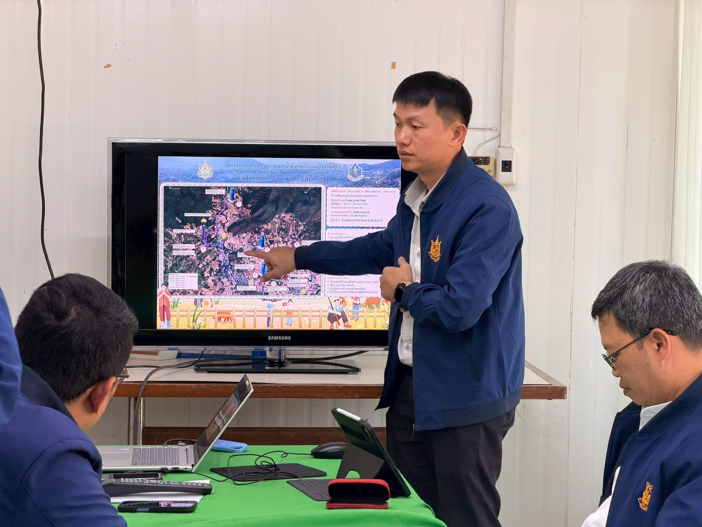 ตามข้อสั่งการของ ท่านธีระชุณ บุญสิทธิ์ อธิบดีกรมทรัพยากรน้ำ ให้เร่งรัดการดำเนินงานโครงการประจำปีงบประมาณปี 2568 (งบกระตุ้นเศรษฐกิจ) โดย นางสาวสุพัดสอน สีมืด ผู้อำนวยการสำนักงานทรัพยากรน้ำที่ 1 หมอบหมายให้ นายศุภักษร ผลเจริญ ผู้อำนวยการส่วนพัฒนาและฟื้นฟูแหล่งน้ำ พร้อมด้วยเจ้าหน้าที่ ลงพื้นที่เร่งรัด/ติดตาม โครงการก่อสร้างระบบกระจายน้ำด้วยพลังงานแสงอาทิตย์ขุมเหมืองแม่ทาน สนับสนุนสิริราชโมเดล ตำบลสันดอนแก้ว อำเภอแม่ทะ จังหวัดลำปาง โครงการดังกล่าวฯ มีงานระบบสูบน้ำด้วยพลังงานแสงอาทิตย์ขนาด 37 กิโลวัตต์ จำนวน 1 แห่ง ขนาด 22 กิโลวัตต์ จำนวน 1 แห่ง และ ขนาด 11 กิโลวัตต์ จำนวน 1 แห่ง , มีงานท่อส่งน้ำ HDPE ความยาวไม่น้อยกว่า 11,783 ม. , ก่อสร้างถังเก็บน้ำแชมเปญ ขนาด 300 ลบ.ม. จำนวน 1 แห่ง และ ขนาด 200 ลบ.ม. จำนวน 1 แห่ง , มีงานก่อสร้างถังเก็บน้ำไฟเบอร์กราส ขนาด 100 ลบ.ม. จำนวน 4 แห่ง , ก่อสร้างระบบน้ำดื่มสะอาด จำนวน 7 แห่ง ปัจจุบันมีผลการดำเนินงาน 30% สามารถช่วยเหลือและบรรเทาปัญหาขาดแคลนน้ำ อุปโภค บริโภค น้ำเพื่อการเกษตร ให้กับเกษตร และประชาชนในพื้นที่กว่า 250 ไร่ 50 ครัวเรือน