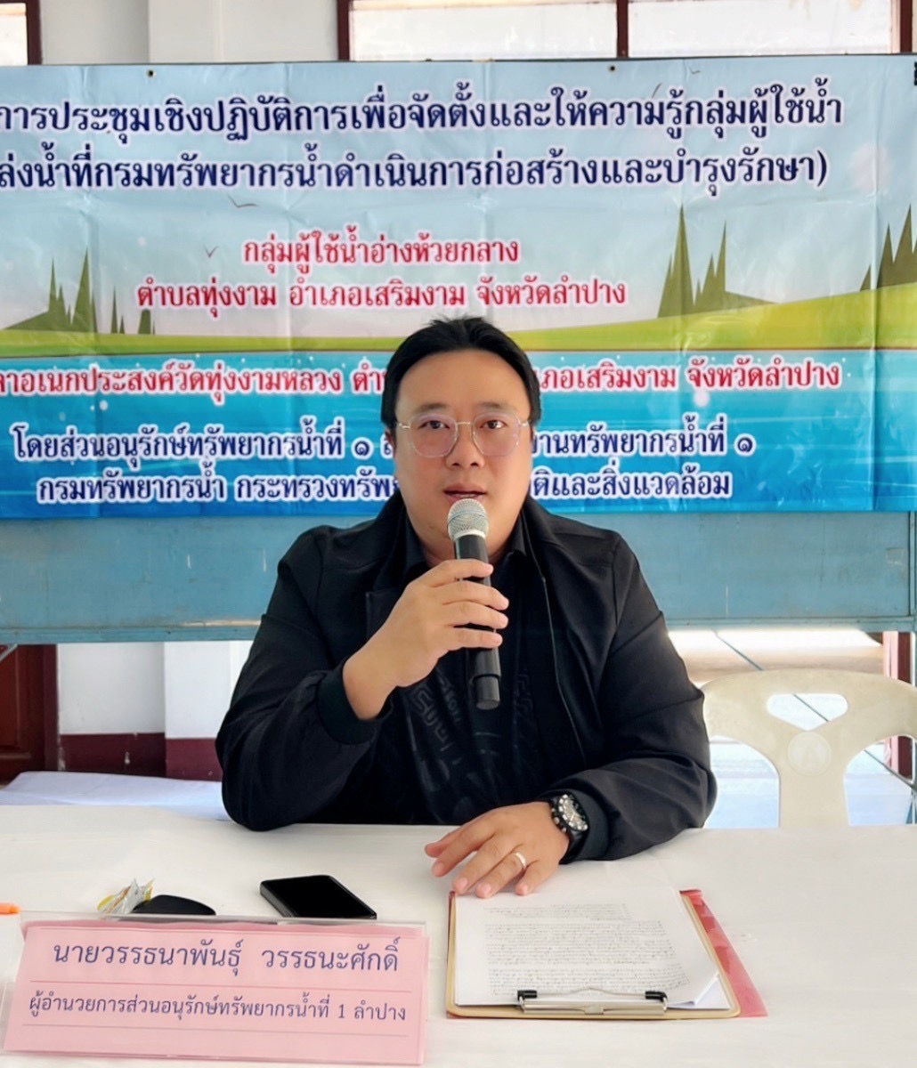นางสาวสุพัดสอน สีมืด ผู้อำนวยการสำนักงานทรัพยากรน้ำที่ 1 มอบหมายให้ส่วนอนุรักษ์ทรัพยากรน้ำที่ 1 ลำปางจัดโครงการประชุมเชิงปฏิบัติการเพื่อจัดตั้งและให้ความรู้กลุ่มผู้ใช้น้ำ (แหล่งน้ำที่กรมทรัพยากรน้ำดำเนินการก่อสร้างและบำรุงรักษา)กลุ่มผู้ใช้น้ำอ่างเก็บน้ำห้วยกลาง ณ ศาลาอเนกประสงค์วัดทุ่งงามหลวง ตำบลทุ่งงาม อำเภอเสริมงาม จังหวัดลำปาง มีผู้เข้าร่วมประชุมประกอบด้วย ผู้ใหญ่บ้าน ประชาชนในพื้นที่ และกลุ่มผู้ใช้น้ำอ่างเก็บน้ำห้วยกลาง จำนวน 96 คน ซึ่งส่วนอนุรักษ์ทรัพยากรน้ำที่ 1 ลำปาง ได้บรรยายให้ความรู้ทางวิชาการสร้างความเข้าใจเกี่ยวกับบทบาทหลักของกรมทรัพยากรน้ำและภารกิจของส่วนอนุรักษ์ทรัพยากรน้ำที่ 1 ลำปาง รวมทั้งจัดตั้งกลุ่มผู้ใช้น้ำในพื้นที่ดังกล่าว