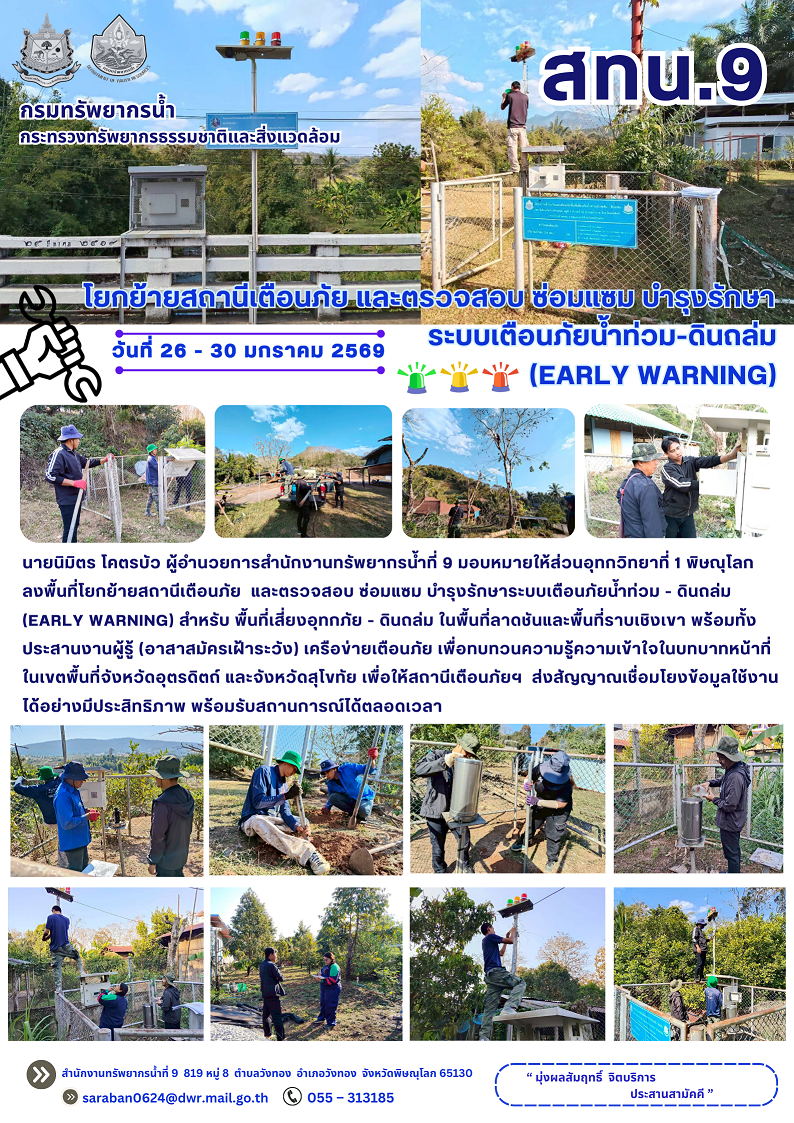 วันที่ 26 -30 มกราคม 2569 นายนิมิตร โคตรบัว ผู้อำนวยการสำนักงานทรัพยากรน้ำที่ 9 มอบหมายให้ส่วนอุทกวิทยาที่ 1 พิษณุโลก ลงพื้นที่โยกย้ายสถานีเตือนภัย และตรวจสอบ ซ่อมแซม บำรุงรักษาระบบเตือนภัยน้ำท่วม - ดินถล่ม (Early Warning) สำหรับ พื้นที่เสี่ยงอุทกภัย - ดินถล่ม ในพื้นที่ลาดชันและพื้นที่ราบเชิงเขา พร้อมทั้งประสานงานผู้รู้ (อาสาสมัครเฝ้าระวัง) เครือข่ายเตือนภัย เพื่อทบทวนความรู้ความเข้าใจในบทบาทหน้าที่ ในเขตพื้นที่จังหวัดอุตรดิตถ์ และจังหวัดสุโขทัย เพื่อให้สถานีเตือนภัยฯ ส่งสัญญาณเชื่อมโยงข้อมูลใช้งานได้อย่างมีประสิทธิภาพ พร้อมรับสถานการณ์ได้ตลอดเวลา