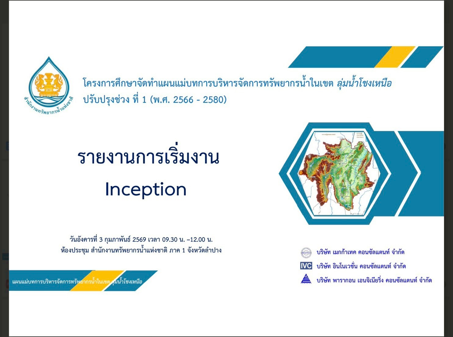 ในที่ประชุมมีการนำเสนอ ภาพรวมโครงการ แนวทางการจัดทำแผนแม่บทการบริหารจัดการทรัพยากรน้ำในเขตลุ่มน้ำด้วยกระบวนการ SEA การศึกษาวิเคราะห์ข้อมูลพื้นฐานลุ่มน้ำ สภาพปัญหาด้านทรัพยากรน้ำ แผนงานและแนวทางการศึกษาแต่ละด้าน การประชาสัมพันธ์และการมีส่วนร่วมของประชาชน แบบสำรวจการบริหารจัดการน้ำและทรัพยากรน้ำ และแผนดำเนินงานการประชุมปฐมนิเทศโครงการ โดย บจก.เมกก้าเทค คอนซัลแตนท์ บจก.อินโนเวชั่น คอนซัลแตนท์ บจก.พารากอน เอนจิเนียริ่ง คอนซัลแตนท์ ซึ่งหน่วยงานส่วนต่างๆ ได้ให้ข้อเสนอและข้อซักถามในรายละเอียดโครงการฯ ตาม TOR ที่ สทนช.จัดทำขึ้น โดยผู้จัดทำรายงานฯ รับทราบและจะนำไปปรับปรุงแผนการดำเนินงานตามคำแนะนำต่อไป