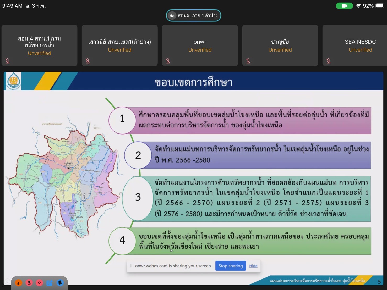 นางสาวสุพัดสอน สีมืด ผู้อำนวยการสำนักงานทรัพยากรน้ำที่ 1 มอบหมายให้ ส่วนอนุรักษ์ทรัพยากรน้ำที่ 4 เชียงราย เข้าร่วมประชุมพิจารณารายงานการเริ่มงาน (Inception Report) โครงการศึกษาจัดทำแผนแม่บทการบริหารจัดการทรัพยากรน้ำ ในเขตลุ่มน้ำโขงเหนือ ปรับปรุงช่วงที่ 1 (พ.ศ.2566-2580) โดยมี นายอนันต์ เพ็ชร์หนู ผู้อำนวยการสำนักงานทรัพยากรน้ำแห่งชาติภาค 1 เป็นประธานการประชุม ซึ่งมีผู้เข้าร่วมประชุมทั้ง ณ ที่ตั้งสำนักงานทรัพยากรน้ำแห่งชาติภาค 1 และผ่านสื่ออิเล็กทรอนิกส์