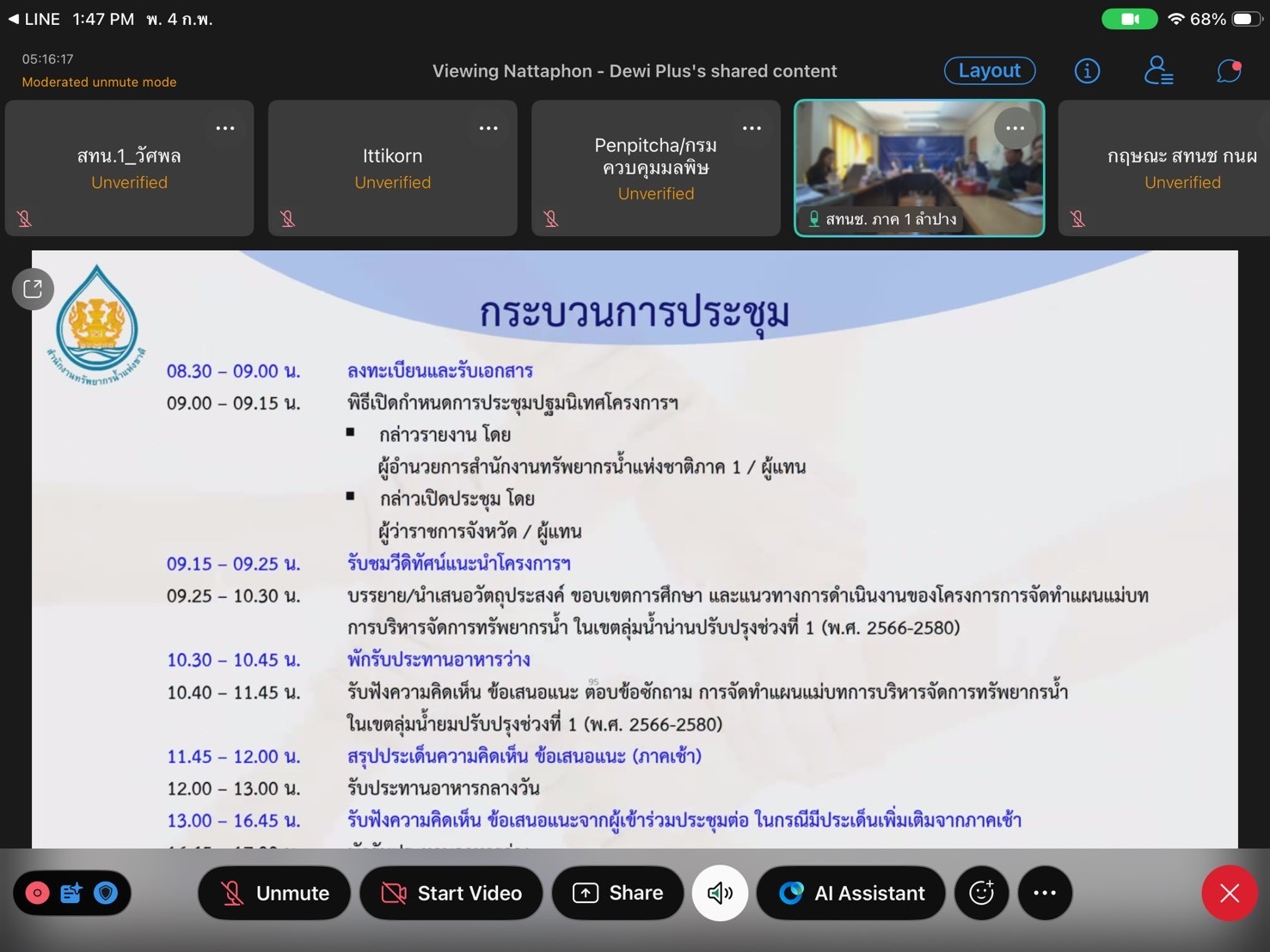 นางสาวสุพัดสอน สีมืด ผู้อำนวยการสำนักงานทรัพยากรน้ำที่ 1 มอบหมายให้ ส่วนอนุรักษ์ทรัพยากรน้ำที่ 4 เชียงราย เข้าร่วมประชุมพิจารณารายงานการเริ่มงาน (Inception Report) โครงการศึกษาจัดทำแผนแม่บทการบริหารจัดการทรัพยากรน้ำ ในเขตลุ่มน้ำยม ปรับปรุงช่วงที่ 1 (พ.ศ.2566-2580) โดยมี นายอนันต์ เพ็ชร์หนู ผู้อำนวยการสำนักงานทรัพยากรน้ำแห่งชาติภาค 1 เป็นประธานการประชุม ซึ่งมีผู้เข้าร่วมประชุมทั้ง ณ ที่ตั้งสำนักงานทรัพยากรน้ำแห่งชาติภาค 1 และผ่านสื่ออิเล็กทรอนิกส์
