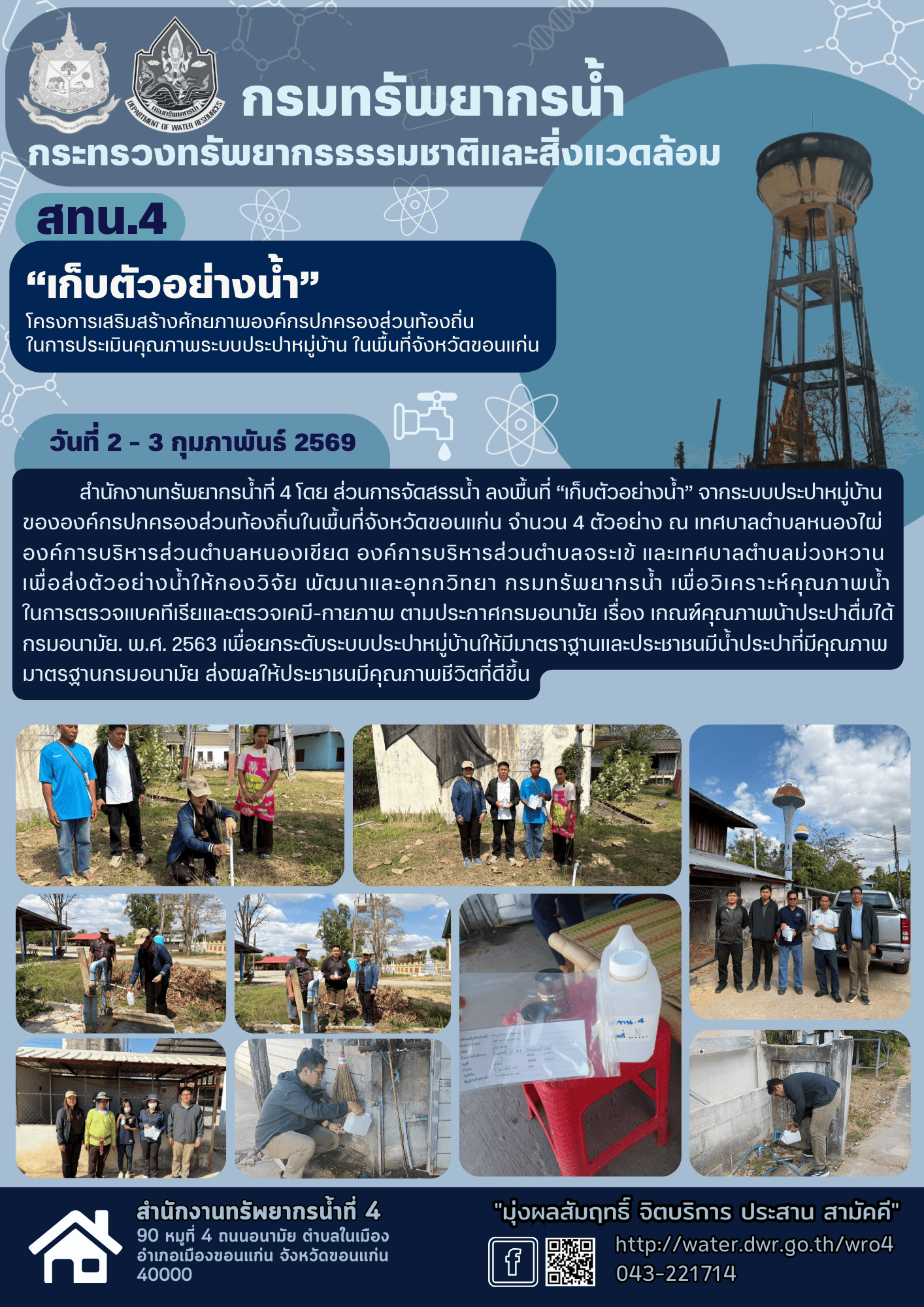 เมื่อวันที่ วันที่ 2 - 3 กุมภาพันธ์ 2569 สำนักงานทรัพยากรน้ำที่ 4 โดย ส่วนการจัดสรรน้ำ ลงพื้นที่ “เก็บตัวอย่างน้ำ” จากระบบประปาหมู่บ้านขององค์กรปกครองส่วนท้องถิ่นในพื้นที่จังหวัดขอนแก่น จำนวน 4 ตัวอย่าง ณ เทศบาลตำบลหนองไผ่ องค์การบริหารส่วนตำบลหนองเขียด องค์การบริหารส่วนตำบลจระเข้ และเทศบาลตำบลม่วงหวาน เพื่อส่งตัวอย่างน้ำให้กองวิจัย พัฒนาและอุทกวิทยา กรมทรัพยากรน้ำ เพื่อวิเคราะห์คุณภาพน้ำในการตรวจแบคทีเรียและตรวจเคมี-กายภาพ ตามประกาศกรมอนามัย เรื่อง เกณฑ์คุณภาพน้าประปาดื่มได้กรมอนามัย. พ.ศ. 2563 เพื่อยกระดับระบบประปาหมู่บ้านให้มีมาตราฐานและประชาชนมีน้ำประปาที่มีคุณภาพมาตรฐานกรมอนามัย ส่งผลให้ประชาชนมีคุณภาพชีวิตที่ดีขึ้น