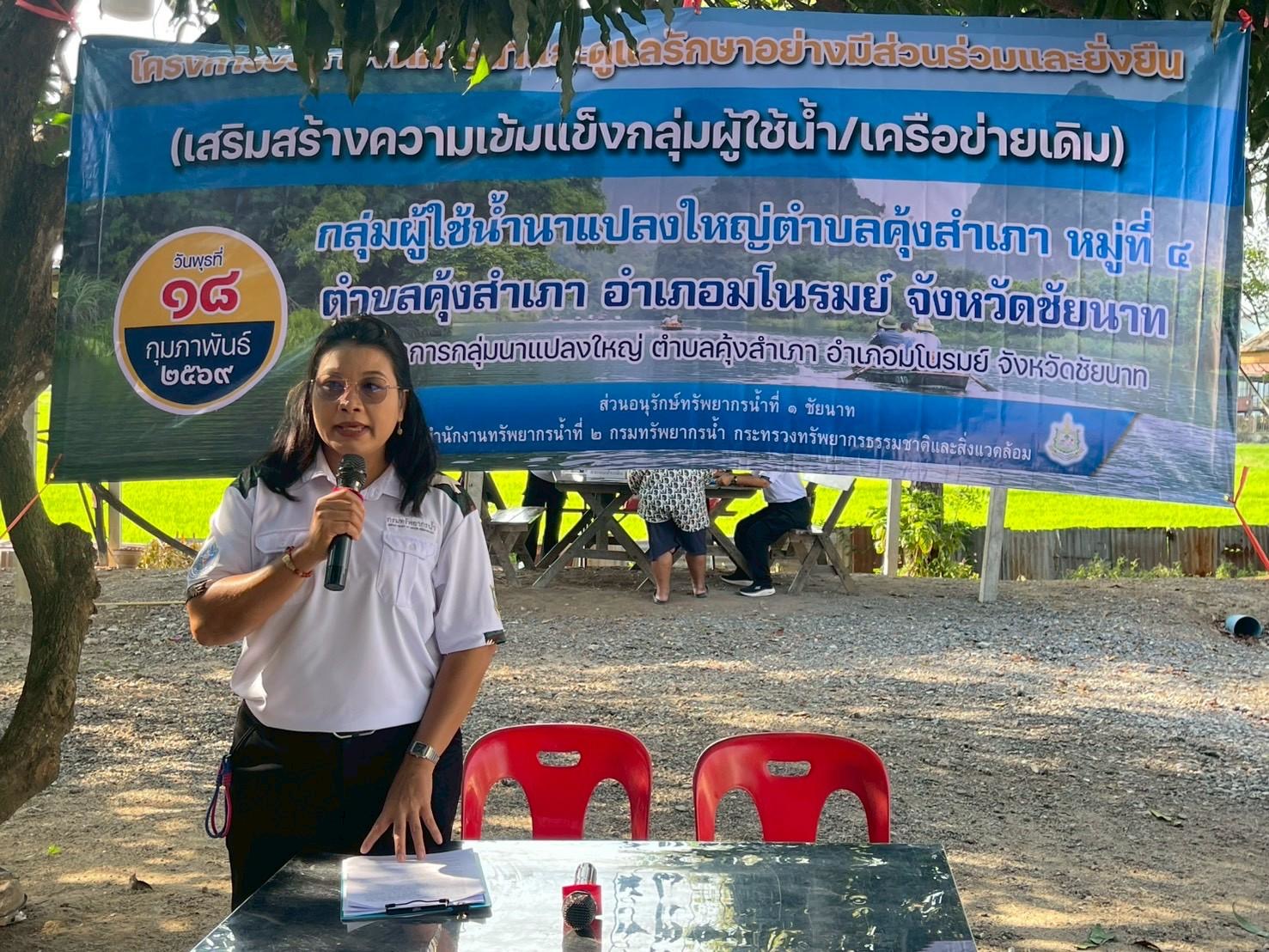 นายสิทธิชัย ปริญญาขจร ผู้อำนวยการสำนักงานทรัพยากรน้ำที่ 2 มอบหมายให้ นางพัชราภร มูลผล ผู้อำนวยการส่วนอนุรักษ์ทรัพยากรน้ำที่ 1 ชัยนาท พร้อมด้วยเจ้าหน้าที่ ดำเนินการจัดโครงการบริหารจัดการน้ำและดูแลรักษาอย่างมีส่วนร่วมและยั่งยืน (เสริมสร้างความเข้มแข็งกลุ่มผู้ใช้น้ำ/เครือข่ายเดิม) กลุ่มผู้ใช้น้ำนาแปลงใหญ่ตำบลคุ้งสำเภา หมู่ที่ 4 ตำบลคุ้งสำเภา อำเภอมโนรมย์ จังหวัดชัยนาท ณ ที่ทำการกลุ่มนาแปลงใหญ่ ตำบลคุ้งสำเภา อำเภอมโนรมย์ จังหวัดชัยนาท ซึ่งมีการให้ความรู้ในการส่งเสริมอาชีพ เพิ่มทางเลือก เพิ่มรายได้ให้เกษตรกร โดยการปลูกผักสลัดแบบลงดิน และการปลูกในวัสดุเหลือใช้ การสร้างรายได้จากการเพาะเลี้ยงแมลงเศรษฐกิจ เพื่อเป็นแหล่งโปรตีนทางเลือกใหม่ (Future Food) และได้ร่วมกันปรับปรุงภูมิทัศน์บริเวณพื้นที่ของโครงการฯ ทำความสะอาดชุดผลิตไฟฟ้าด้วยพลังงานแสงอาทิตย์ (Solar cell) ซึ่งเป็นกิจกรรมเสริมสร้างความเข้มแข็งและสร้างความสัมพันธ์ระหว่างสมาชิกกลุ่มผู้ใช้น้ำ โดยมี นายมรกต ศรีตูมแก้ว นายอำเภอมโนรมย์ และนายสุวิทย์ บุญรอด นายกเทศมนตรีตำบลมโนรมย์เข้าร่วมเป็นเกียรติในโครงการฯ ครั้งนี้ด้วย