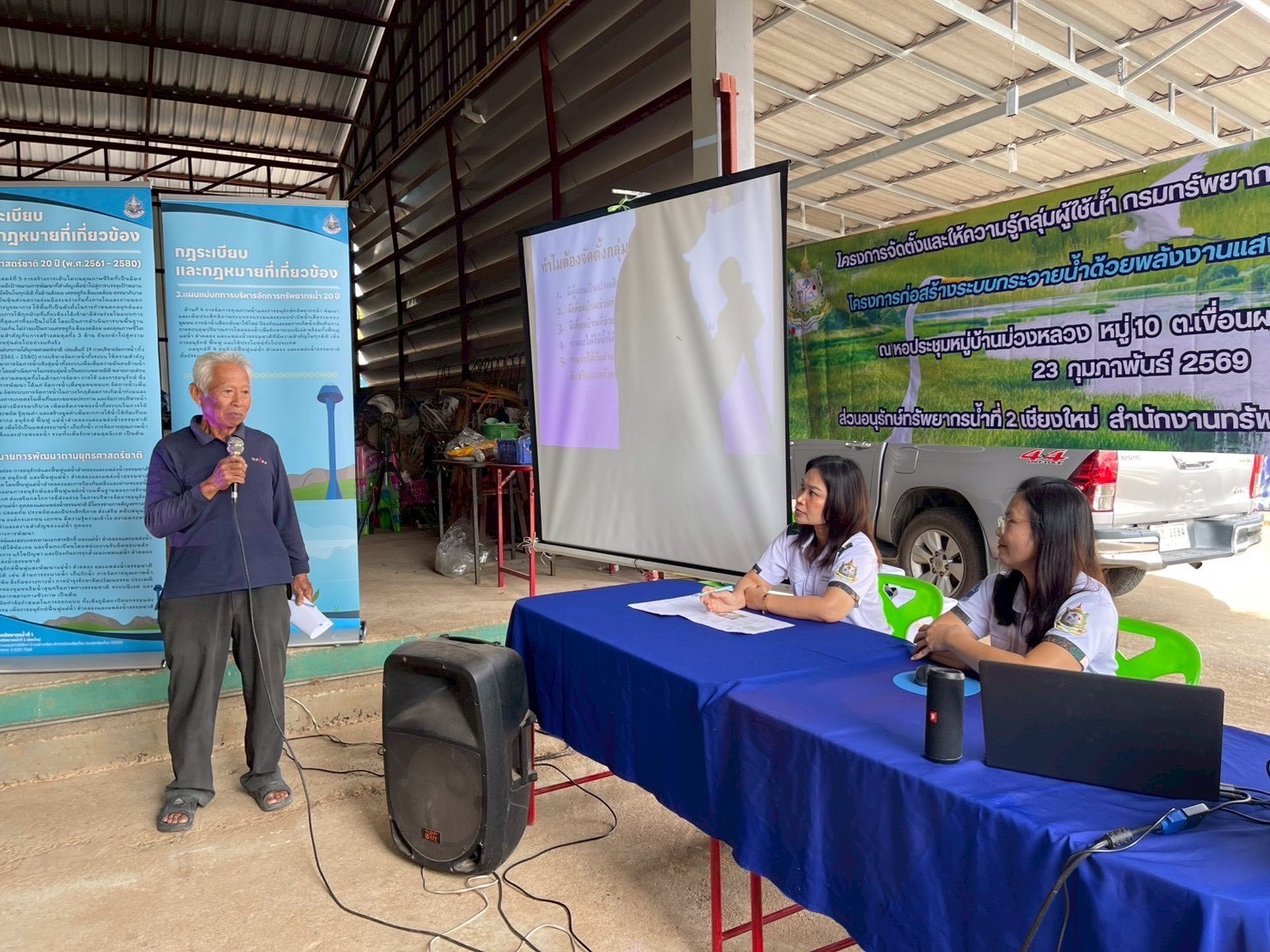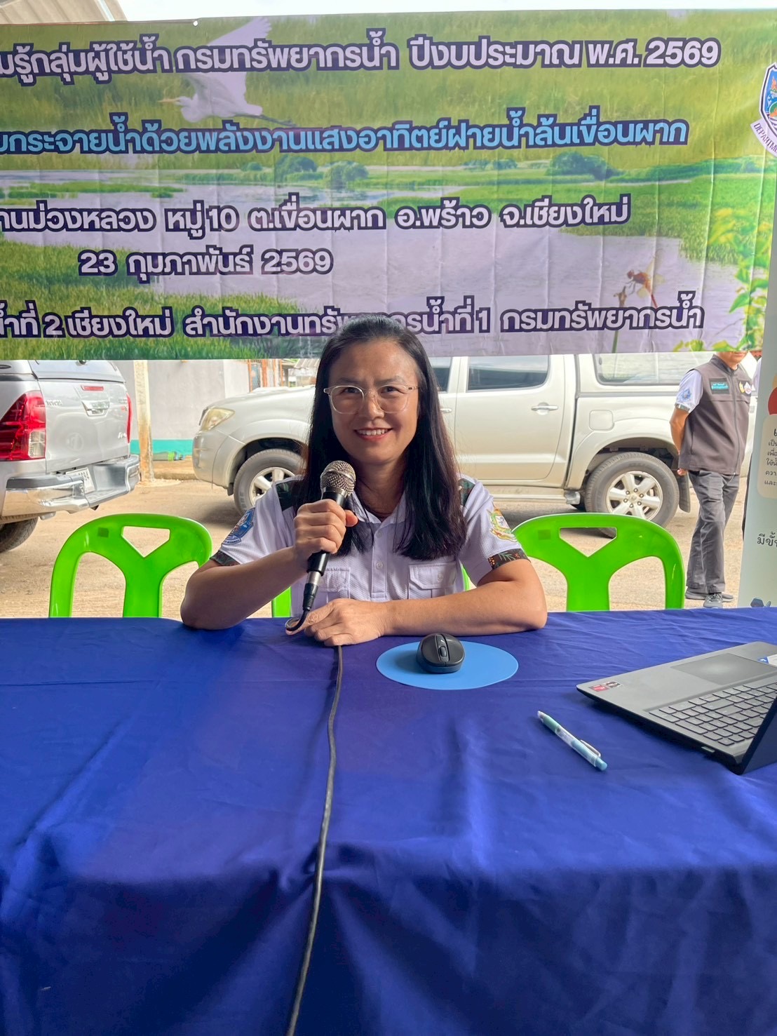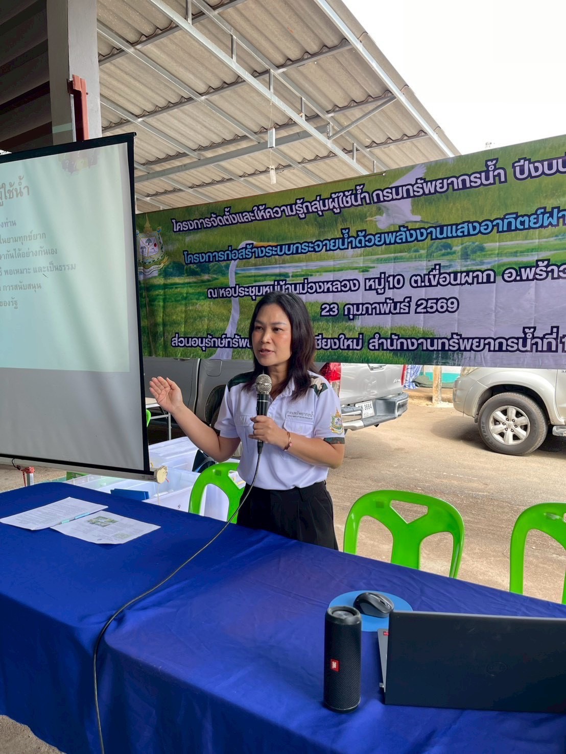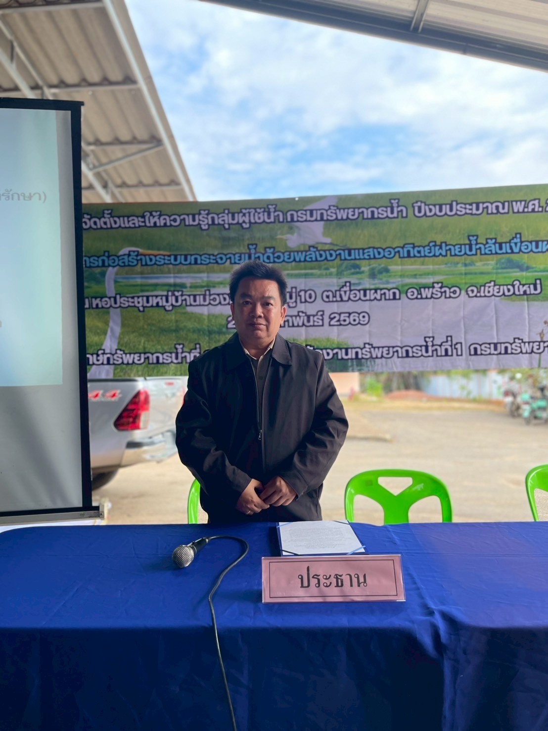 นางสาวสุพัดสอน สีมืด ผู้อำนวยการสำนักงานทรัพยากรน้ำที่ 1 มอบหมายให้ส่วนอนุรักษ์ทรัพยากรน้ำที่ 2 เชียงใหม่ ดำเนินโครงการจัดตั้งและให้ความรู้กลุ่มผู้ใช้น้ำ (แหล่งน้ำที่กรมทรัพยากรน้ำดำเนินการก่อสร้างและบำรุงรักษา) ปีงบประมาณ พ.ศ. 2569 กลุ่มผู้ใช้น้ำโครงการก่อสร้างระบบกระจายน้ำด้วยพลังงานแสงอาทิตย์ ฝายน้ำล้นเขื่อนผาก หมู่ 10 ตำบลเขื่อนผาก อำเภอพร้าว จังหวัดเชียงใหม่ โดยมี นายเสก กรุณาหล่าย ผู้อำนวยการกองช่าง ผู้แทนนายกเทศมนตรีตำบลเขื่อนผาก เป็นประธานเปิดโครงการฯ และให้แนวคิดการบริหารจัดการน้ำตามหลักปรัชญาเศรษฐกิจพอเพียง ณ หอประชุมหมู่บ้านม่วงหลวง หมู่ 10 ตำบลเขื่อนผาก อำเภอพร้าว จังหวัดเชียงใหม่ เพื่อให้มีการบริหารจัดการทรัพยากรน้ำ และรวมกลุ่มดูแลบำรุงรักษาแหล่งน้ำ ให้อยู่ในสภาพดี และมีประสิทธิภาพ สามารถจัดสรรแบ่งปันน้ำระหว่างสมาชิกในกลุ่มได้อย่างเป็นธรรมและเกิดประโยชน์สูงสุด โดยมีผู้เข้าร่วมโครงการ จำนวน 48 คน