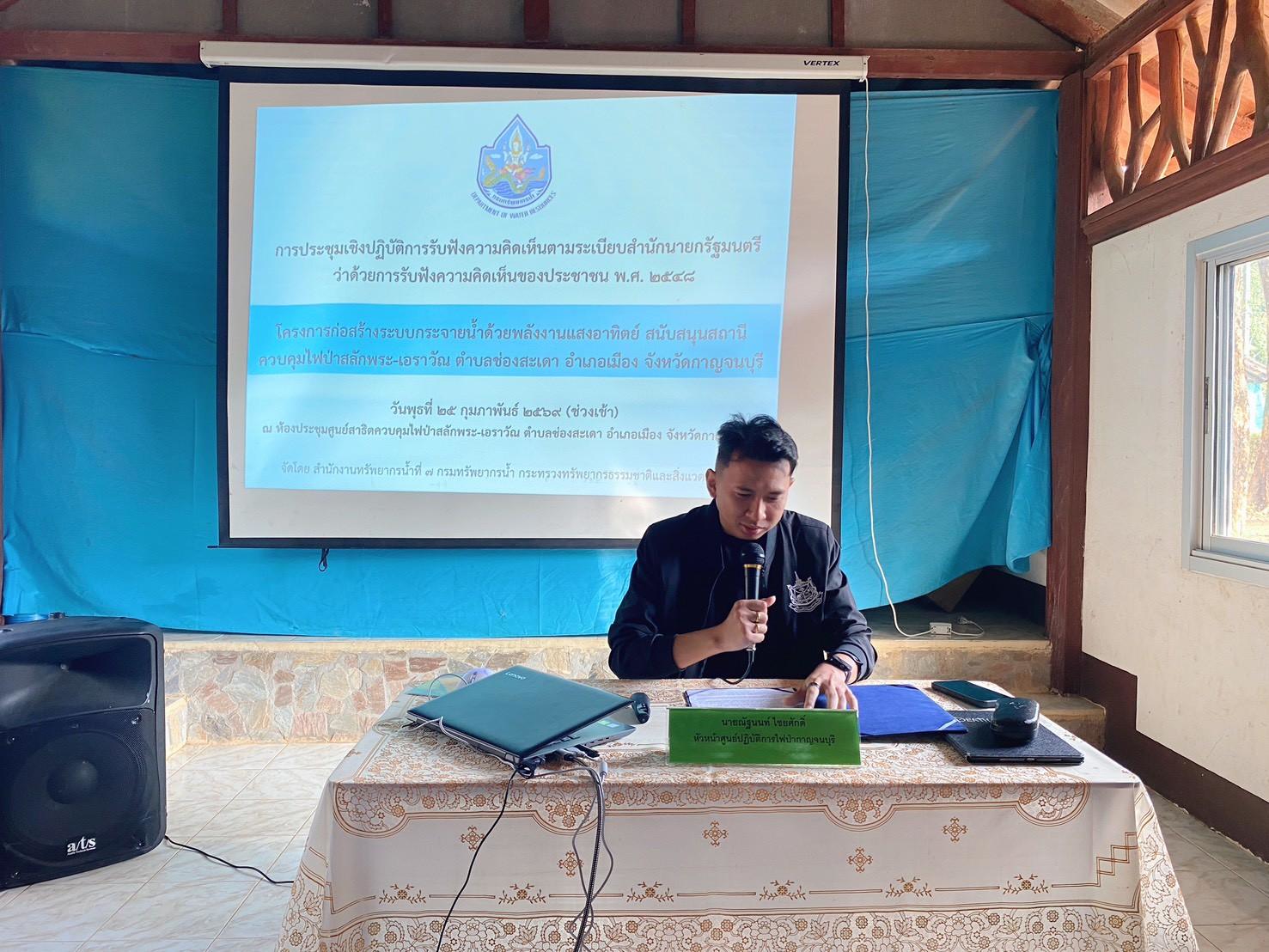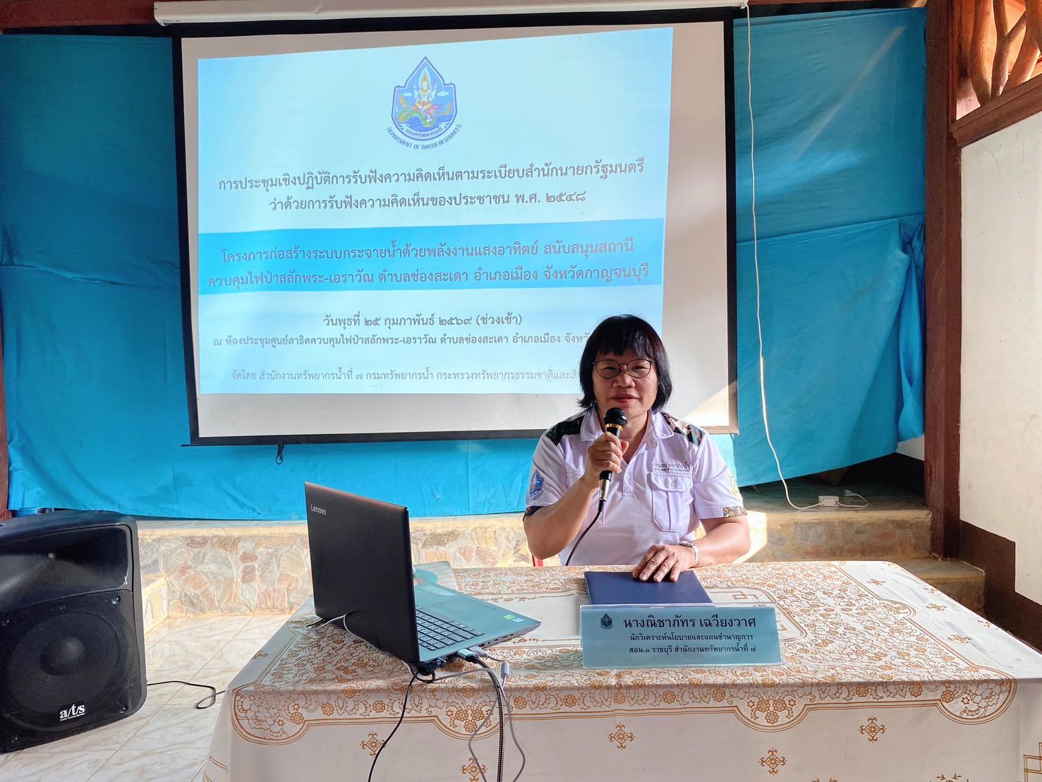 สทน.7 จัดประชุมเชิงปฏิบัติการรับฟังความคิดเห็นของประชาชน โครงการก่อสร้างระบบกระจายน้ำด้วยพลังงานแสงอาทิตย์ สนับสนุนสถานีควบคุมไฟป่าสลักพระ-เอราวัณ จังหวัดกาญจนบุรี