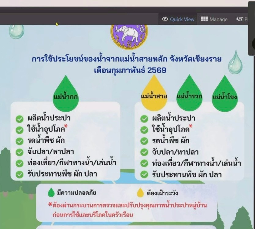 เพื่อวางกรอบการทำงานเชิงรุก ปกป้องสุขภาพพี่น้องประชาชนและสิ่งแวดล้อมอย่างเป็นระบบ คุมเข้มคุณภาพน้ำ – ทางออกใหม่ลดเวลารอผลที่ประชุมได้รับรายงานจากสำนักงานสิ่งแวดล้อมและควบคุมมลพิษที่ 1 ซึ่งทำการสุ่มตรวจคุณภาพน้ำมาแล้ว 4 ครั้ง ผลปรากฏว่า “น้ำในลุ่มน้ำหลักส่วนใหญ่อยู่ในเกณฑ์มาตรฐาน” ประชาชนสามารถใช้อุปโภคบริโภค