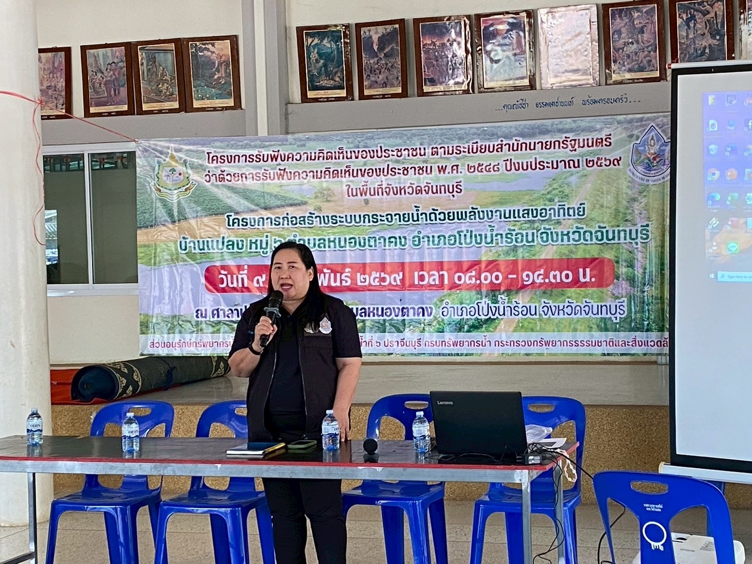 วันที่ 9 กุมภาพันธ์ 2569 สำนักงานทรัพยากรน้ำที่ 6 โดยส่วนอนุรักษ์ทรัพยากรน้ำที่ 3 จันทบุรี นำโดยนางสาวศลิษา พานิชผล ผู้อำนวยการส่วนอนุรักษ์ทรัพยากรน้ำที่ 3 จันทบุรี พร้อมด้วยเจ้าหน้าที่ ดำเนินการรับฟังความคิดเห็นของประชาชนตามระเบียบ สำนักนายกรัฐมนตรี ว่าด้วยการรับฟังความคิดเห็นของประชาชน พ.ศ.2548 โครงการก่อสร้างระบบกระจายน้ำด้วยพลังงานแสงอาทิตย์บ้านแปลง หมู่ 6 ตำบลหนองตาคง อำเภอโป่งน้ำร้อน จังหวัดจันทบุรี โดยมีเจ้าหน้าที่สำนักงานทรัพยากรน้ำที่ 6 ร่วมเป็นวิทยากร โครงการฯ ดังกล่าวมีวัตถุประสงค์เพื่อช่วยเหลือประชาชนจากสถานการณ์ภัยแล้ง บรรเทาปัญหาอุทกภัยในพื้นที่ เป็นแหล่งกักเก็บน้ำไว้ใช้ในช่วงฤดูแล้งสำหรับอุปโภค บริโภค และเกษตรกรรม เพิ่มศักยภาพพื้นที่เพาะปลูกและแก้ปัญหาการขาดแคลนน้ำที่ยั่งยืน ปรับปรุงระบบนิเวศให้เกิดสมดุลกลับคืนสู่ธรรมชาติ โดยมีนายกเทศมนตรีตำบลหนองตาคง สมาชิกสภาเทศบาล เจ้าหน้าที่เทศบาล ผู้ใหญ่บ้าน ประชาชนและผู้มีส่วนได้ส่วนเสียในพื้นที่เข้าร่วมรับฟังความคิดเห็นฯ จำนวน 61 คน