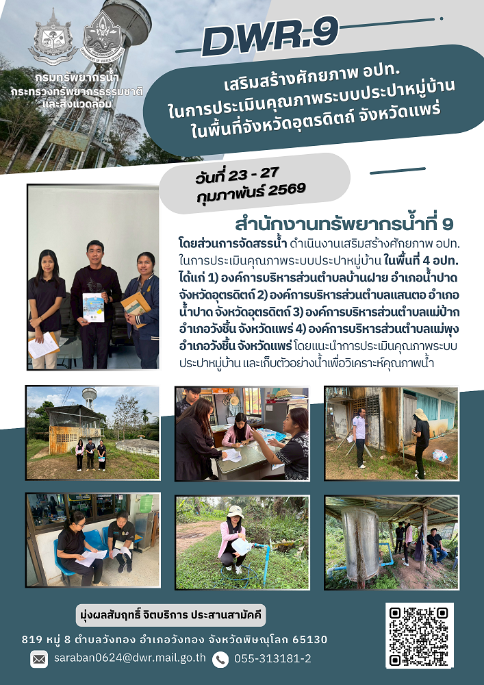 วันที่ 23-27 กุมภาพันธ์ 2569 สำนักงานทรัพยากรน้ำที่ 9 โดยส่วนการจัดสรรน้ำ ดำเนินงานเสริมสร้างศักยภาพ อปท.ในการประเมินคุณภาพระบบประปาหมู่บ้าน ในพื้นที่ 4 อปท.ได้แก่ 1) องค์การบริหารส่วนตำบลบ้านฝาย อำเภอน้ำปาด จังหวัดอุตรดิตถ์ 2) องค์การบริหารส่วนตำบลแสนตอ อำเภอน้ำปาด จังหวัดอุตรดิตถ์ 3) องค์การบริหารส่วนตำบลแม่ป้าก อำเภอวังชิ้น จังหวัดแพร่ 4) องค์การบริหารส่วนตำบลแม่พุง อำเภอวังชิ้น จังหวัดแพร่ โดยแนะนำการประเมินคุณภาพระบบประปาหมู่บ้าน และเก็บตัวอย่างน้ำเพื่อวิเคราะห์คุณภาพน้ำ