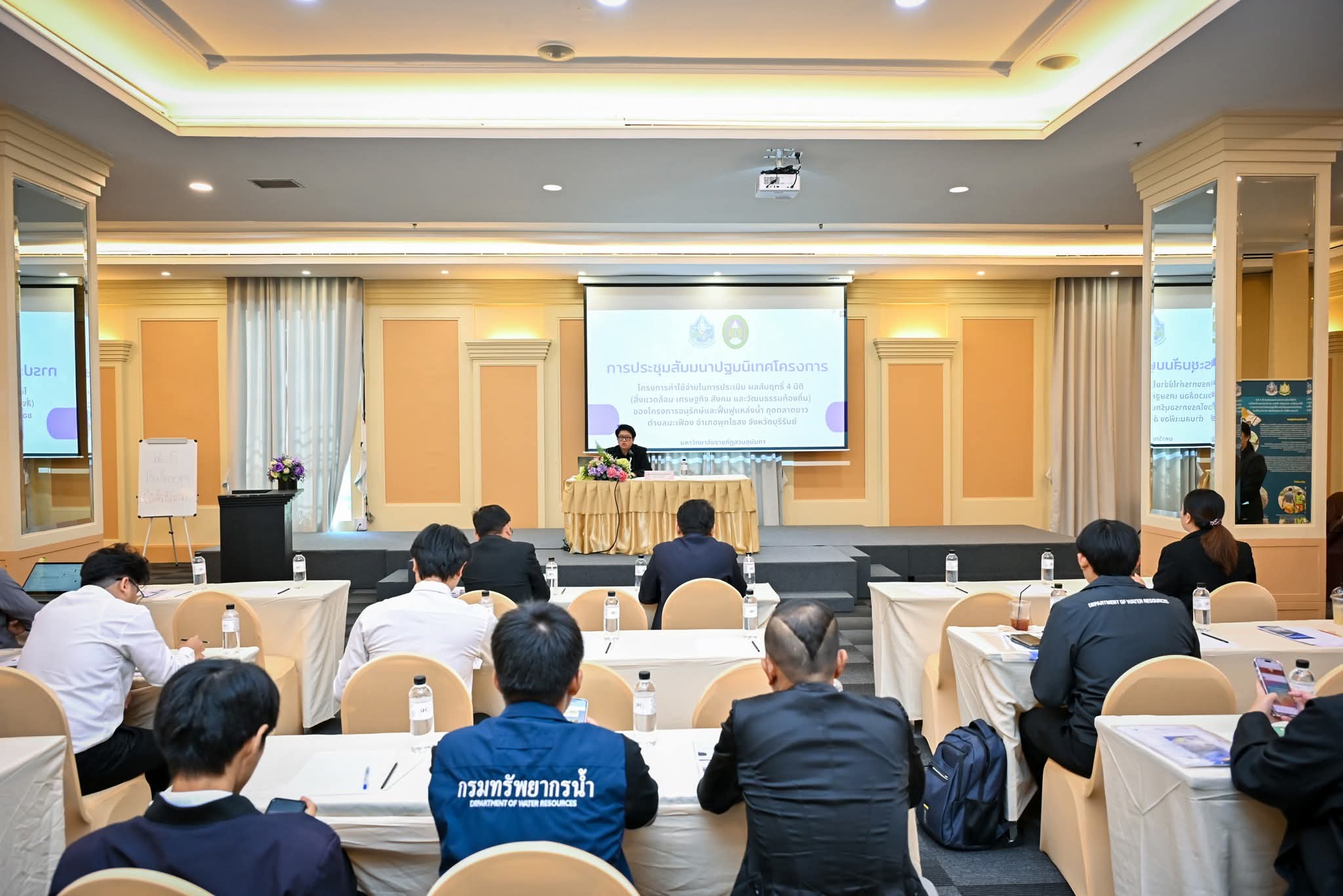 วันนี้ (4 มีนาคม 2569) นายธีระชุณ บุญสิทธิ์ อธิบดีกรมทรัพยากรน้ำ มอบหมายให้ นางกานดา คูประเสริฐ ผู้อำนวยการกองพัฒนาแหล่งน้ำ 2 เป็นประธานเปิดการประชุมสัมมนาปฐมนิเทศโครงการค่าใช้จ่ายในการประเมินผลสัมฤทธิ์ 4 มิติ ได้แก่ ด้านสิ่งแวดล้อม เศรษฐกิจ สังคม และวัฒนธรรมท้องถิ่น ของโครงการอนุรักษ์และฟื้นฟูแหล่งน้ำกุดตลาดยาว ตำบลมะเฟือง อำเภอพุทไธสง จังหวัดบุรีรัมย์ โดยมีผู้แทนหน่วยงานที่เกี่ยวข้อง นักวิชาการ ผู้เชี่ยวชาญ และผู้มีส่วนได้ส่วนเสียเข้าร่วมการประชุม ณ ห้องประชุมประดิพัทธ์ ชั้น 1 โรงแรมเดอะ ควอเตอร์ สะพานควาย บาย ยูเอชจี กรุงเทพมหานคร การประชุมครั้งนี้มีวัตถุประสงค์เพื่อชี้แจงความเป็นมา วัตถุประสงค์ และกรอบแนวคิดของการดำเนินโครงการ รวมทั้งเปิดเวทีแลกเปลี่ยนความคิดเห็นเกี่ยวกับแนวทางการประเมินผลสัมฤทธิ์ของโครงการอนุรักษ์และฟื้นฟูแหล่งน้ำใน 4 มิติสำคัญ อันจะนำไปสู่การพัฒนาตัวชี้วัดที่เหมาะสมและสอดคล้องกับบริบทของพื้นที่ นอกจากนี้ ภายในงานยังมีการเสวนาทางวิชาการในหัวข้อ “แนวการประเมินผลสัมฤทธิ์ 4 มิติของโครงการอนุรักษ์และฟื้นฟูแหล่งน้ำ” โดยผู้ทรงคุณวุฒิจากภาควิชาการและผู้เชี่ยวชาญด้านการประเมินผลกระทบสิ่งแวดล้อม พร้อมทั้งกิจกรรมระดมความคิดเห็น (Workshop) แบ่งกลุ่มตามภูมิภาค เพื่อร่วมกันเสนอแนวทางและตัวชี้วัดที่เหมาะสมในการประเมินผลสัมฤทธิ์ของโครงการให้ครอบคลุมทั้งด้านสิ่งแวดล้อม เศรษฐกิจ สังคม และวัฒนธรรมท้องถิ่น