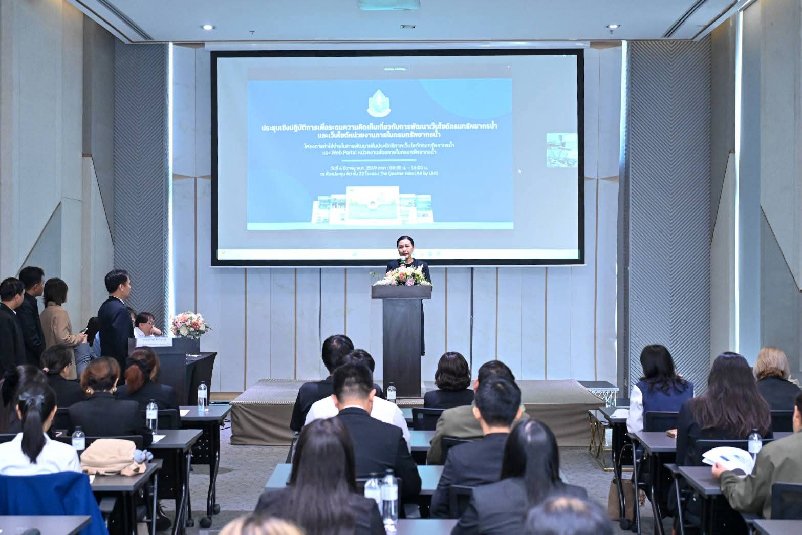วันนี้ (6 มีนาคม 2569) นางสาวบุญธิดา เปล่งแสง รองอธิบดีกรมทรัพยากรน้ำ เป็นประธานเปิดการประชุมเชิงปฏิบัติการเพื่อระดมความคิดเห็นเกี่ยวกับการพัฒนาเว็บไซต์กรมทรัพยากรน้ำ และเว็บไซต์หน่วยงานภายในกรมทรัพยากรน้ำ โดยมีนายวรวิทย์ ชัยวิมลกุล ผู้อำนวยการศูนย์เทคโนโลยีสารสนเทศและการสื่อสาร ผู้บริหาร วิทยากร และเจ้าหน้าที่จากส่วนกลางและสำนักงานทรัพยากรน้ำที่ 1–11 เข้าร่วม ณ ห้องประชุม Ari 1 ชั้น 22 โรงแรม เดอะ ควอเตอร์ อารีย์ บาย ยูเอชจี การประชุมจัดขึ้นเพื่อรับฟังความคิดเห็นจากผู้ใช้งานจริง วิเคราะห์ปัญหาและข้อจำกัดของระบบเดิม เพื่อนำไปสู่การพัฒนาเว็บไซต์ของกรมทรัพยากรน้ำให้มีความทันสมัย มีประสิทธิภาพ และสอดคล้องกับมาตรฐานเว็บไซต์ภาครัฐ โดยมุ่งเน้นการปรับปรุงโครงสร้างเว็บไซต์ การพัฒนาระบบ Web Portal สำหรับหน่วยงานภายใน และการเชื่อมโยงข้อมูลของหน่วยงานต่าง ๆ ให้สามารถใช้งานร่วมกันได้อย่างมีประสิทธิภาพ รองอธิบดีกรมทรัพยากรน้ำ กล่าวว่า เว็บไซต์ถือเป็นเครื่องมือสำคัญในการขับเคลื่อนองค์กรสู่การเป็นหน่วยงานภาครัฐดิจิทัล และเป็นช่องทางหลักในการสื่อสารข้อมูลและให้บริการประชาชนอย่างรวดเร็วและทั่วถึง พร้อมเน้นย้ำการพัฒนาใน 3 มิติสำคัญ ได้แก่ การออกแบบประสบการณ์ผู้ใช้งาน ให้ใช้งานง่ายและตอบโจทย์ผู้ใช้ มาตรฐานเว็บไซต์ภาครัฐ เพื่อความมั่นคงปลอดภัย และการเชื่อมโยงข้อมูลระหว่างหน่วยงาน เพื่อยกระดับการบริหารจัดการข้อมูลขององค์กรให้มีประสิทธิภาพมากยิ่งขึ้น