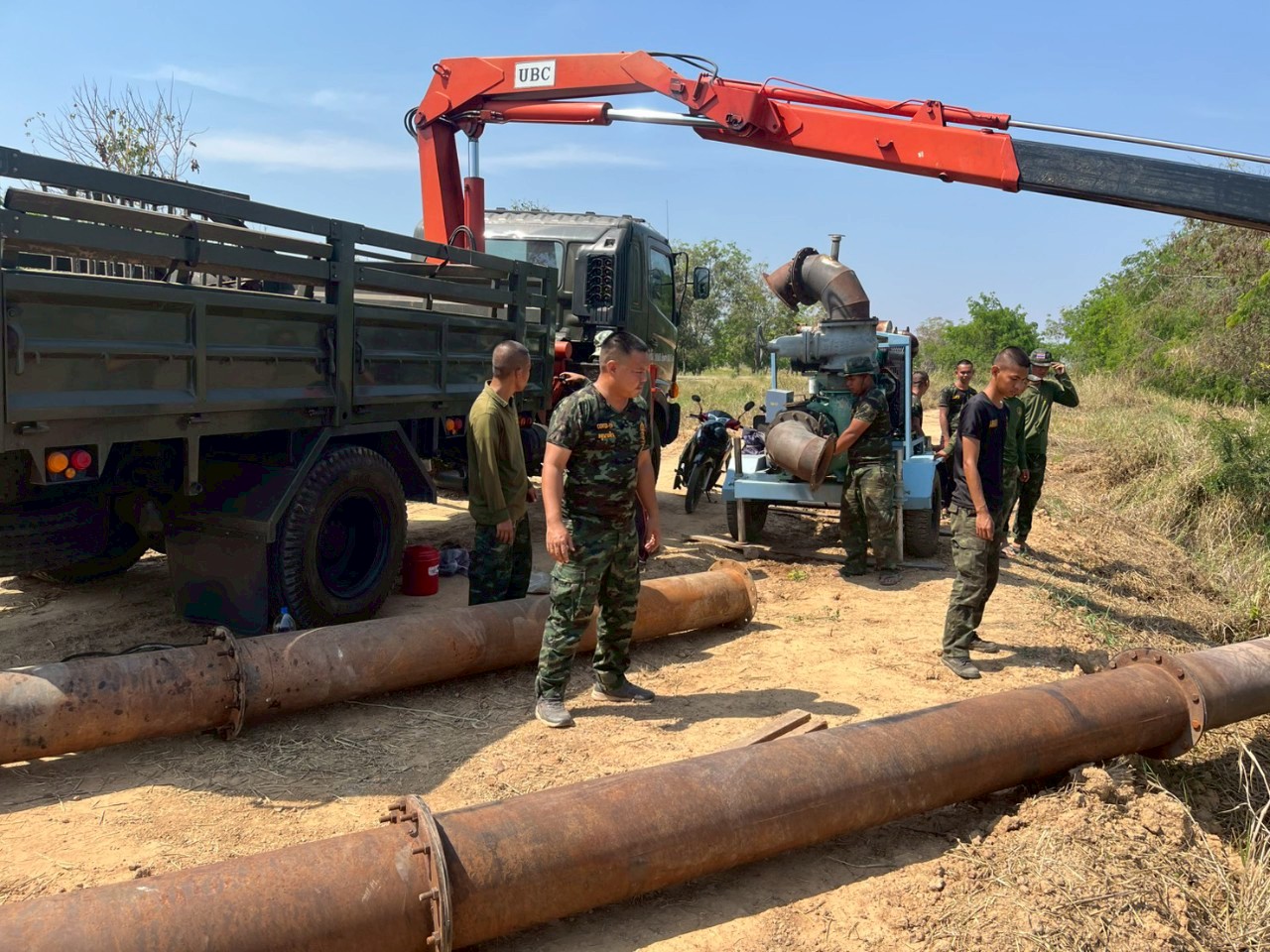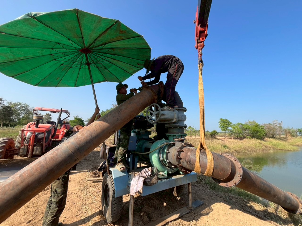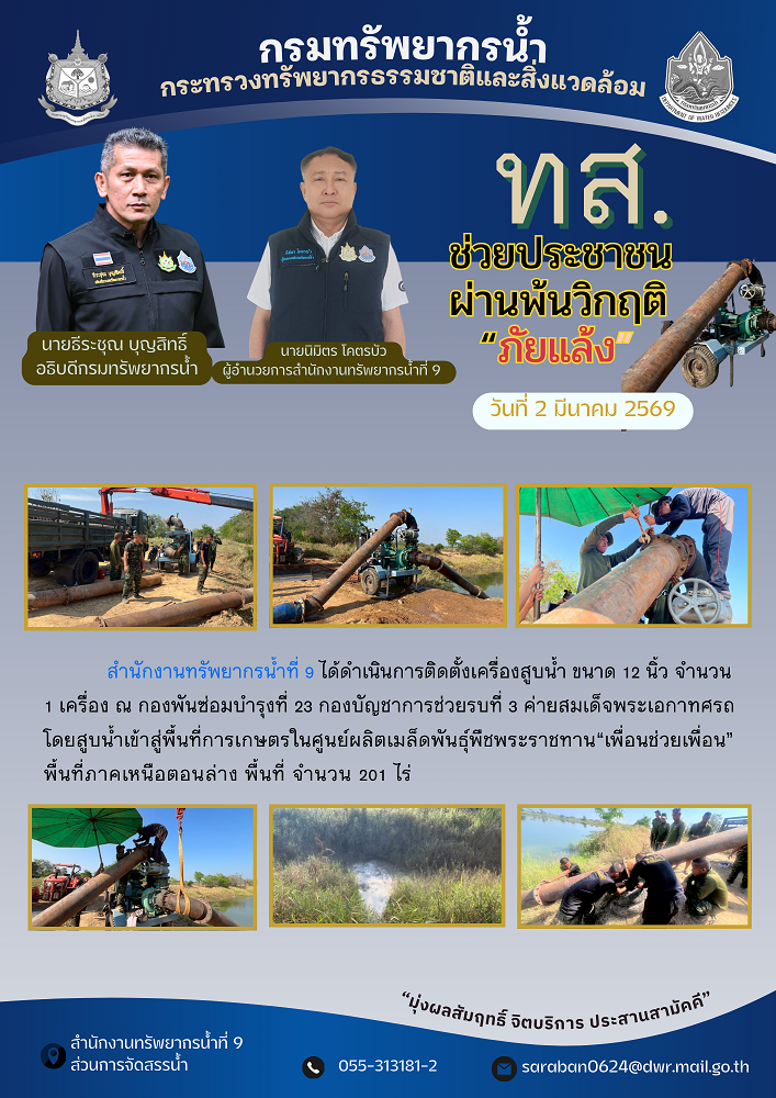 สำนักงานทรัพยากรน้ำที่ 9 ดำเนินการติดตั้งเครื่องสูบน้ำ ขนาด 12 นิ้ว จำนวน 1 เครื่อง ณ กองพันซ่อมบำรุงที่ 23 กองบัญชาการช่วยรบที่ 3 ค่ายสมเด็จพระเอกาทศรถ โดยสูบน้ำเข้าสู่พื้นที่การเกษตร ในศูนย์ผลิตเมล็ดพันธุ์พืชพระราชทาน “เพื่อนช่วยเพื่อน” พื้นที่ภาคเหนือตอนล่าง พื้นที่ จำนวน 201 ไร่