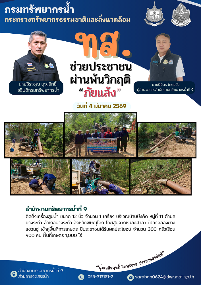 สำนักงานทรัพยากรน้ำที่ 9 ติดตั้งเครื่องสูบน้ำ ขนาด 12 นิ้ว จำนวน 1 เครื่อง บริเวณบ้านบึงคัด หมู่ที่ 11 ตำบลบางระกำ อำเภอบางระกำ จังหวัดพิษณุโลก โดยสูบจากหนองศาลา ไปลงคลองยางแขวนอู่ เข้าสู่พื้นที่การเกษตร มีประชาชนได้รับผลประโยชน์ จำนวน 300 ครัวเรือน 900 คน พื้นที่เกษตร 1,000 ไร่