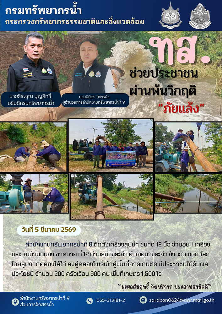 สำนักงานทรัพยากรน้ำที่ 9 ติดตั้งเครื่องสูบน้ำ ขนาด 12 นิ้ว จำนวน 1 เครื่อง บริเวณบ้านหนองเขาควาย ที่ 12 ตำบลบางระกำ อำเภอบางระกำ จังหวัดพิษณุโลก โดยสูบจากคลองไส้ไก่ ลงสู่คลองโพธิ์เข้าสู่พื้นที่การเกษตร มีประชาชนได้รับผลประโยชน์ จำนวน 200 ครัวเรือน 600 คน พื้นที่เกษตร 1,500 ไร่
