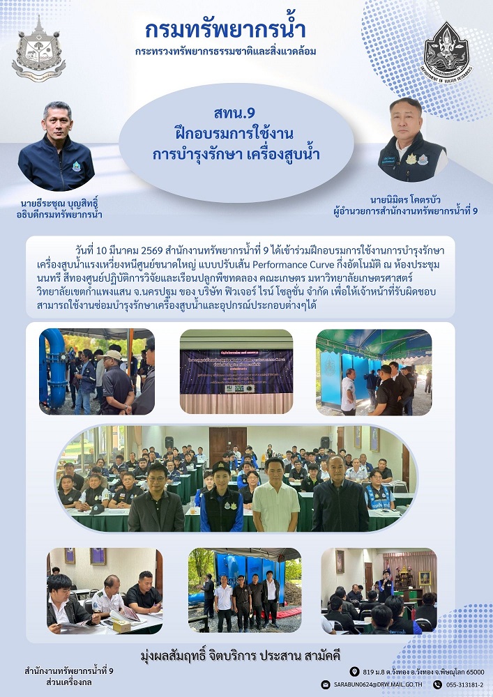 วันที่ 10 มีนาคม 2569 สำนักงานทรัพยากรน้ำที่9ได้เข้าร่วมฝึกอบรมการใช้งานการบำรุงรักษาเครื่องสูบน้ำแรงเหวี่ยงหนีศูนย์ขนาดใหญ่ แบบปรับเส้น Performance Curve กึ่งอัตโนมัติ ณ ห้องประชุมนนทรี สีทองศูนย์ปฏิบัติการวิจัยและเรือนปลูกพืชทดลอง คณะเกษตร มหาวิทยาลัยเกษตรศาสตร์ วิทยาลัยเขตกำแพงแสน จ.นครปฐม ของ บริษัท ฟิวเจอร์ ไรน์ โซลูชั่น จำกัด เพื่อให้เจ้าหน้าที่รับผิดชอบสามารถใช้งานซ่อมบำรุงรักษาเครื่องสูบน้ำและอุปกรณ์ประกอบต่างๆได้