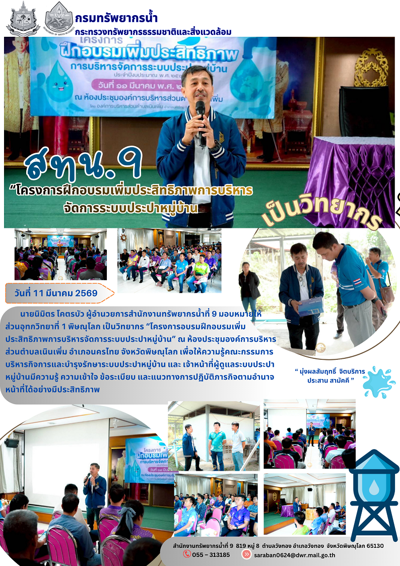 วันที่ 11 มีนาคม 2569 นายนิมิตร โคตรบัว ผู้อำนวยการสำนักงานทรัพยากรน้ำที่ 9 มอบหมายให้ ส่วนอุทกวิทยาที่ 1 พิษณุโลก เป็นวิทยากร “โครงการอบรมฝึกอบรมเพิ่มประสิทธิภาพการบริหารจัดการระบบประปาหมู่บ้าน” ณ ห้องประชุมองค์การบริหารส่วนตำบลเนินเพิ่ม อำเภอนครไทย จังหวัดพิษณุโลก เพื่อให้ความรู้คณะกรรมการบริหารกิจการและบำรุงรักษาระบบประปาหมู่บ้าน และ เจ้าหน้าที่ผู้ดูแลระบบประปาหมู่บ้านมีความรู้ ความเข้าใจ ข้อระเบียบ และแนวทางการปฏิบัติภารกิจตามอำนาจหน้าที่ได้อย่างมีประสิทธิภาพ