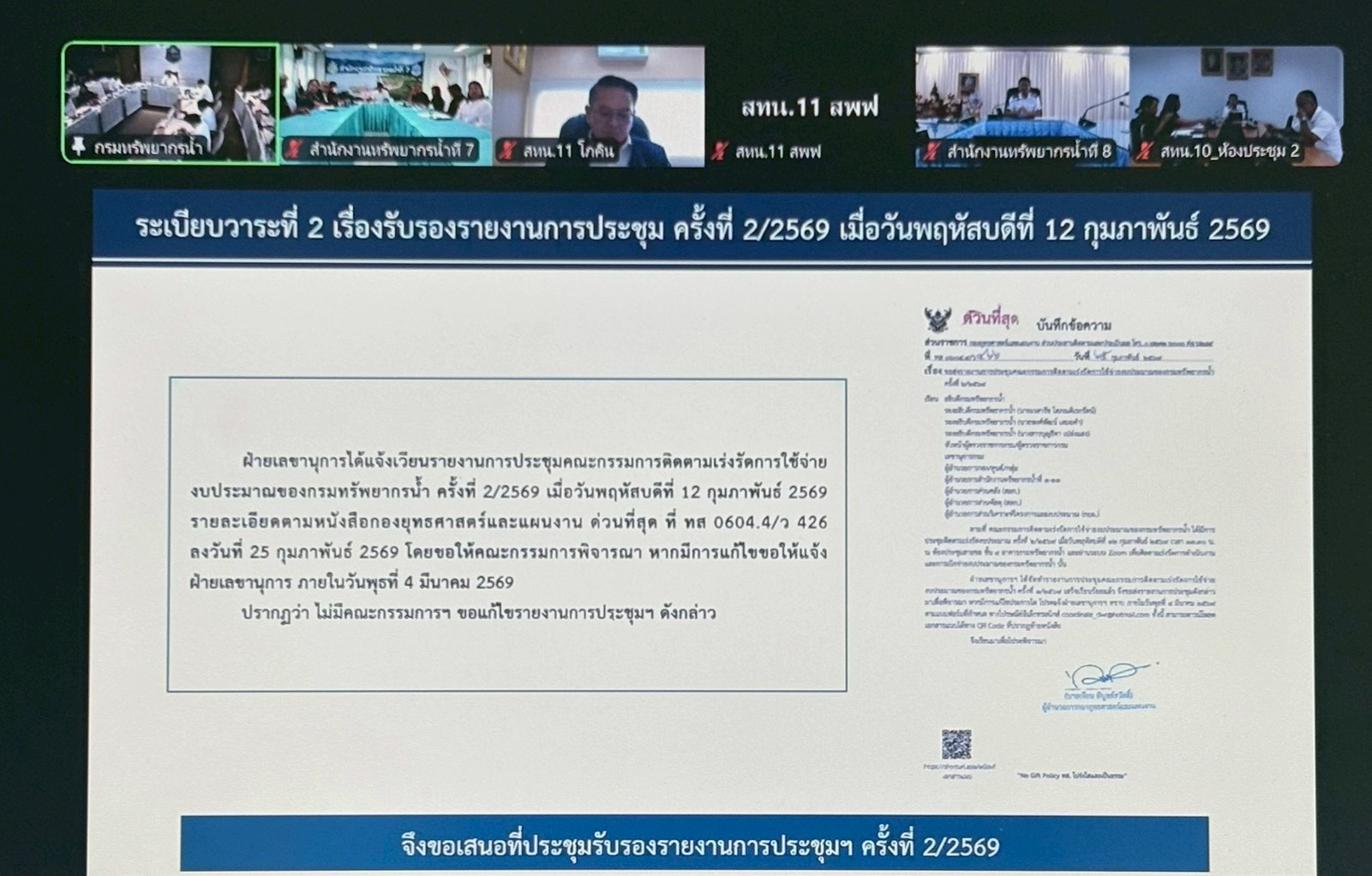วันที่ 19 มีนาคม 2569 นายอนันต์ โพธิ์พันธุ์ ผู้อำนวยการสำนักงานทรัพยากรน้ำที่ 7 พร้อมด้วยคณะผู้บริหาร และเจ้าหน้าที่ที่เกี่ยวข้อง เข้าร่วมประชุมคณะกรรมการติดตามเร่งรัดการใช้จ่ายงบประมาณของกรมทรัพยากรน้ำ ประจำปีงบประมาณ พ.ศ. 2569 ครั้งที่ 3/2569 ผ่านระบบสื่ออิเล็กทรอนิกส์ (Zoom meeting) ณ ห้องประชุม 2 ชั้น 2 อาคารสำนักงานทรัพยากรน้ำที่ 7 โดยมีนายธีระชุณ บุญสิทธิ์ อธิบดีกรมทรัพยากรน้ำ เป็นประธานการประชุม
