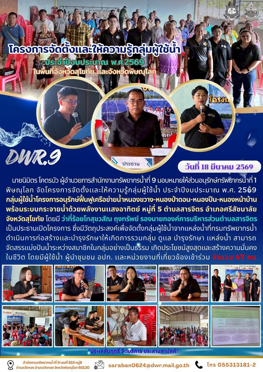 นายนิมิตร โคตรบัว ผู้อำนวยการสำนักงานทรัพยากรน้ำที่ 9 มอบหมายให้ส่วนอนุรักษ์ทรัพยากรน้ำที่ 1 พิษณุโลก จัดโครงการจัดตั้งเเละให้ความรู้กลุ่มผู้ใช้น้ำ ประจำปีงบประมาณ พ.ศ. 2569 กลุ่มผู้ใช้น้ำโครงการอนุรักษ์ฟื้นฟูเครือข่ายน้ำหนองขวาง-หนองป่าดอน-หนองปืน-หนองหน้าบ้าน พร้อมระบบกระจายน้ำด้วยพลังงานเเสงอาทิตย์ หมู่ที่ 5 ตำบลสารจิตร อำเภอศรีสัชนาลัย จังหวัดสุโขทัย โดยมี ว่าที่ร้อยโทสุขวสัณ ถุงทรัพย์ รองนายกองค์การบริหารส่วนตำบลสารจิตร เป็นประธานเปิดโครงการ ซึ่งมีวัตถุประสงค์เพื่อจัดตั้งกลุ่มผู้ใช้น้ำจากเเหล่งน้ำที่กรมทรัพยากรน้ำ ดำเนินการก่อสร้างเเละบำรุงรักษาให้เกิดการรวมกลุ่ม ดูเเล บำรุงรักษา เเหล่งน้ำ สามารถจัดสรรเเบ่งปันน้ำระหว่างสมาชิกในกลุ่มอย่างเป็นธรรม เกิดประโยชน์สูงสุดเเละสร้างความมั่นคงในชีวิต โดยมีผู้ใช้น้ำ ผู้นำชุมชน อปท. เเละหน่วยงานที่เกี่ยวข้องเข้าร่วม จำนวน 47 คน