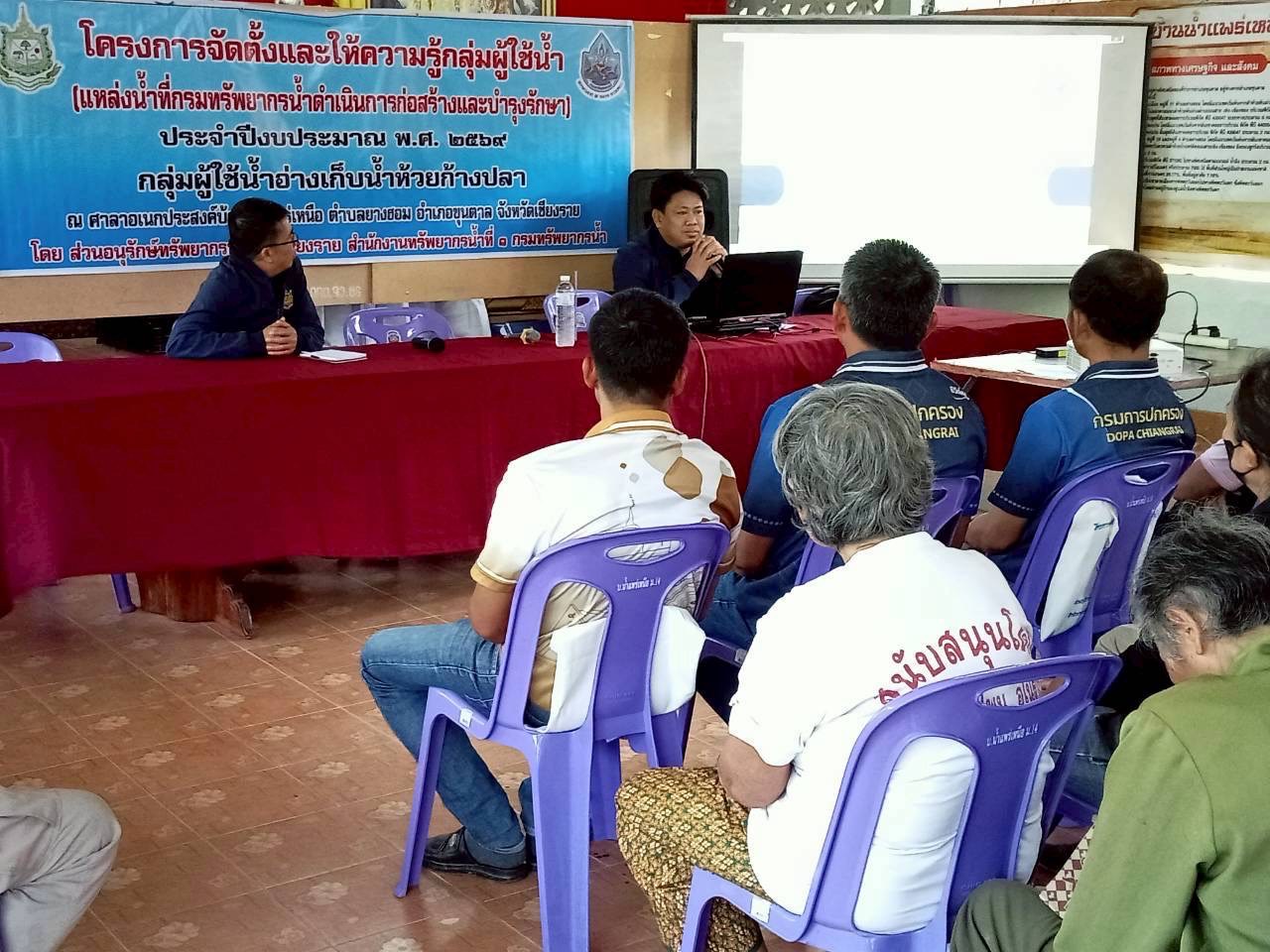 ตามงบประมาณที่ได้รับจัดสรร จากกองอนุรักษ์ทรัพยากรน้ำ กรมทรัพยากรน้ำ ของกลุ่มผู้ใช้น้ำอ่างเก็บน้ำห้วยก้างปลา ต.ยางฮอม อ.ขุนตาล จ.เชียงรายโดยมีนายกฤษฎา ชัยยา นายอำเภอขุนตาล เป็นประธานเปิดโครงการฯ ณ ศาลาอเนกประสงค์บ้านน้ำแพร่เหนือ หมู่ที่14 ต.ยางฮอม อ.ขุนตาล จ.เชียงราย มีผู้เข้าร่วมโครงการฯ 62 คน โดยผู้เข้าร่วมประชุม ได้ร่วมกันดำเนินการ ดังนี้