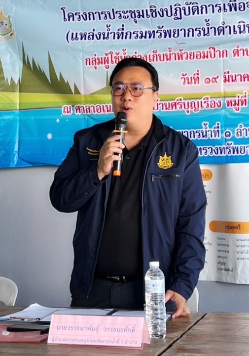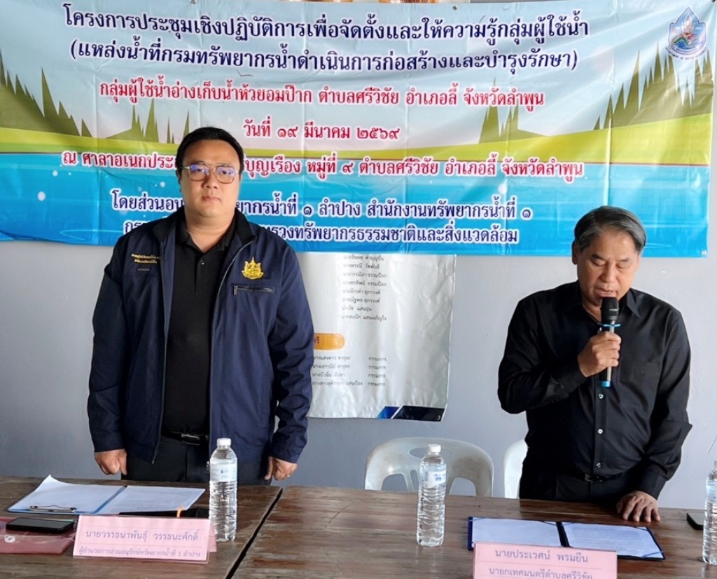 นางสาวสุพัดสอน สีมืด ผู้อำนวยการสำนักงานทรัพยากรน้ำที่ 1 มอบหมายให้ส่วนอนุรักษ์ทรัพยากรน้ำที่ 1 ลำปาง จัดโครงการประชุมเชิงปฏิบัติการเพื่อจัดตั้งและให้ความรู้กลุ่มผู้ใช้น้ำ (แหล่งน้ำที่กรมทรัพยากรน้ำดำเนินการก่อสร้างและบำรุงรักษา) กลุ่มผู้ใช้น้ำจากห้วยอมป๊าก อันเนื่องมาจากพระราชดำริ ฯ ณ ศาลาอเนกประสงค์บ้านศรีบุญเรือง หมู่ที่ 9 ตำบลศรีวิชัย อำเภอลี้ จังหวัดลำพูน โดยมี นายประเวศน์ พรมยืน นายกเทศมนตรีตำบลศรีวิชัย เป็นประธานเปิดการประชุม มีผู้เข้าร่วมประชุม ประกอบด้วย ผู้ใหญ่บ้าน ประชาชนในพื้นที่ และกลุ่มผู้ใช้น้ำจากอ่างเก็บน้ำห้วยอมป๊าก อันเนื่องมาจากพระราชดำริ ฯ จำนวน 62 คน ซึ่งส่วนอนุรักษ์ทรัพยากรน้ำที่ 1 ลำปาง ได้บรรยายให้ความรู้ทางวิชาการสร้างความเข้าใจเกี่ยวกับบทบาทหลักของกรมทรัพยากรน้ำและภารกิจของส่วนอนุรักษ์ทรัพยากรน้ำที่ 1 ลำปาง รวมทั้งจัดตั้งกลุ่มผู้ใช้น้ำในพื้นที่ดังกล่าว