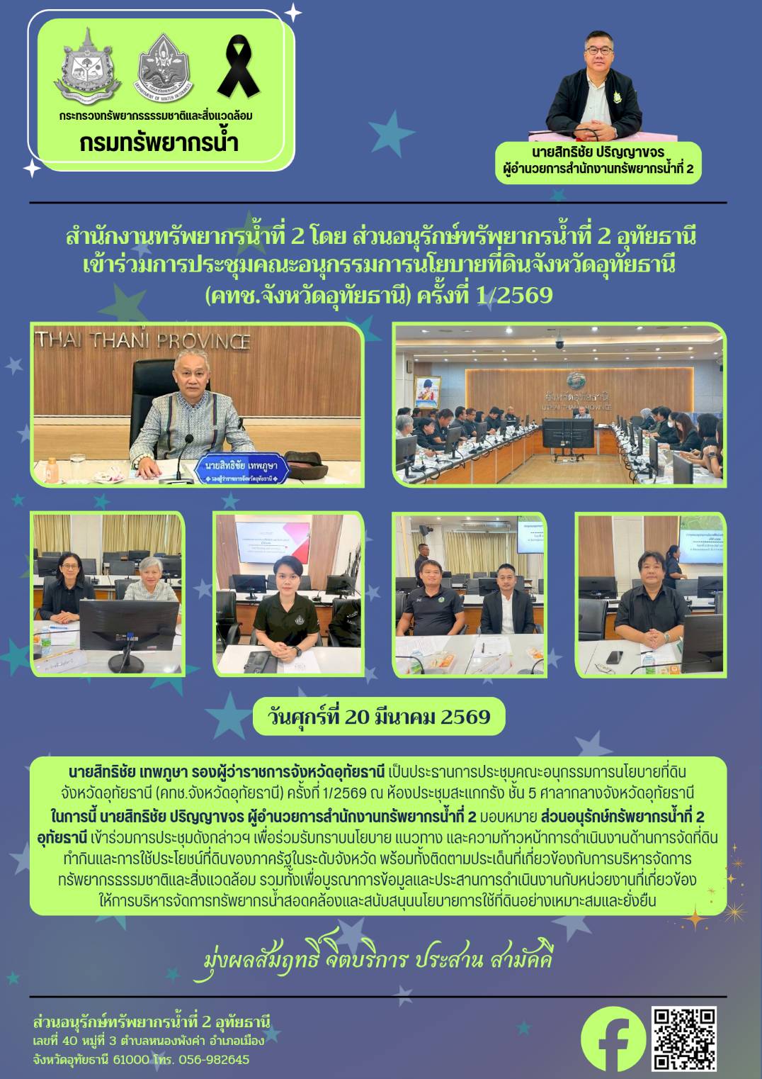 นายสิทธิชัย เทพภูษา รองผู้ว่าราชการจังหวัดอุทัยธานี เป็นประธานการประชุมคณะอนุกรรมการนโยบายที่ดินจังหวัดอุทัยธานี (คทช.จังหวัดอุทัยธานี) ครั้งที่ 1/2569 ณ ห้องประชุมสะแกกรัง ชั้น 5 ศาลากลางจังหวัดอุทัยธานี ในการนี้ นายสิทธิชัย ปริญญาขจร ผู้อำนวยการสำนักงานทรัพยากรน้ำที่ 2 มอบหมาย ส่วนอนุรักษ์ทรัพยากรน้ำที่ 2 อุทัยธานี เข้าร่วมการประชุมดังกล่าวฯ เพื่อร่วมรับทราบนโยบาย แนวทางและความก้าวหน้าการดำเนินงานด้านการจัดที่ดินทำกินและการใช้ประโยชน์ที่ดินของภาครัฐในระดับจังหวัด พร้อมทั้งติดตามประเด็นที่เกี่ยวข้องกับการบริหารจัดการทรัพยากรธรรมชาติและสิ่งแวดล้อม รวมทั้งเพื่อบูรณาการข้อมูลและประสานการดำเนินงานกับหน่วยงานที่เกี่ยวข้องให้การบริหารจัดการทรัพยากรน้ำสอดคล้องและสนับสนุนนโยบายการใช้ที่ดินอย่างเหมาะสมและยั่งยืน
