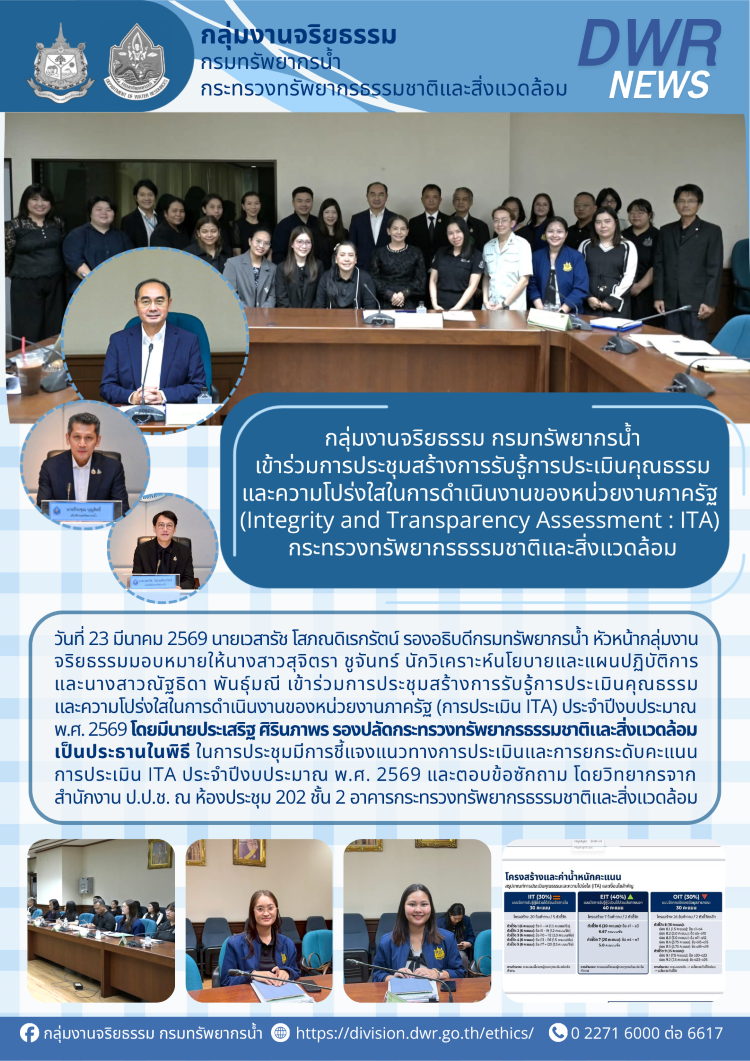 วันที่ 23 มีนาคม 2569 นายเวสารัช โสภณดิเรกรัตน์ รองอธิบดีกรมทรัพยากรน้ำ หัวหน้ากลุ่มงานจริยธรรม มอบหมายให้นางสาวสุจิตรา ชูจันทร์ นักวิเคราะห์นโยบายและแผนปฏิบัติการ และนางสาวณัฐธิดา พันธุ์มณี เข้าร่วมการประชุมสร้างการรับรู้การประเมินคุณธรรมและความโปร่งใสในการดำเนินงานของหน่วยงานภาครัฐ (การประเมิน ITA) ประจำปีงบประมาณ พ.ศ. 2569 โดยมีนายประเสริฐ ศิรินภาพร รองปลัดกระทรวงทรัพยากรธรรมชาติและสิ่งแวดล้อม เป็นประธานในพิธี ในการประชุมมีการชี้แจงแนวทางการประเมินและการยกระดับคะแนนการประเมิน ITA ประจำปีงบประมาณ พ.ศ. 2569 และตอบข้อซักถาม โดยวิทยากรจากสำนักงาน ป.ป.ช. ณ ห้องประชุม 202 ชั้น 2 อาคารกระทรวงทรัพยากรธรรมชาติและสิ่งแวดล้อม