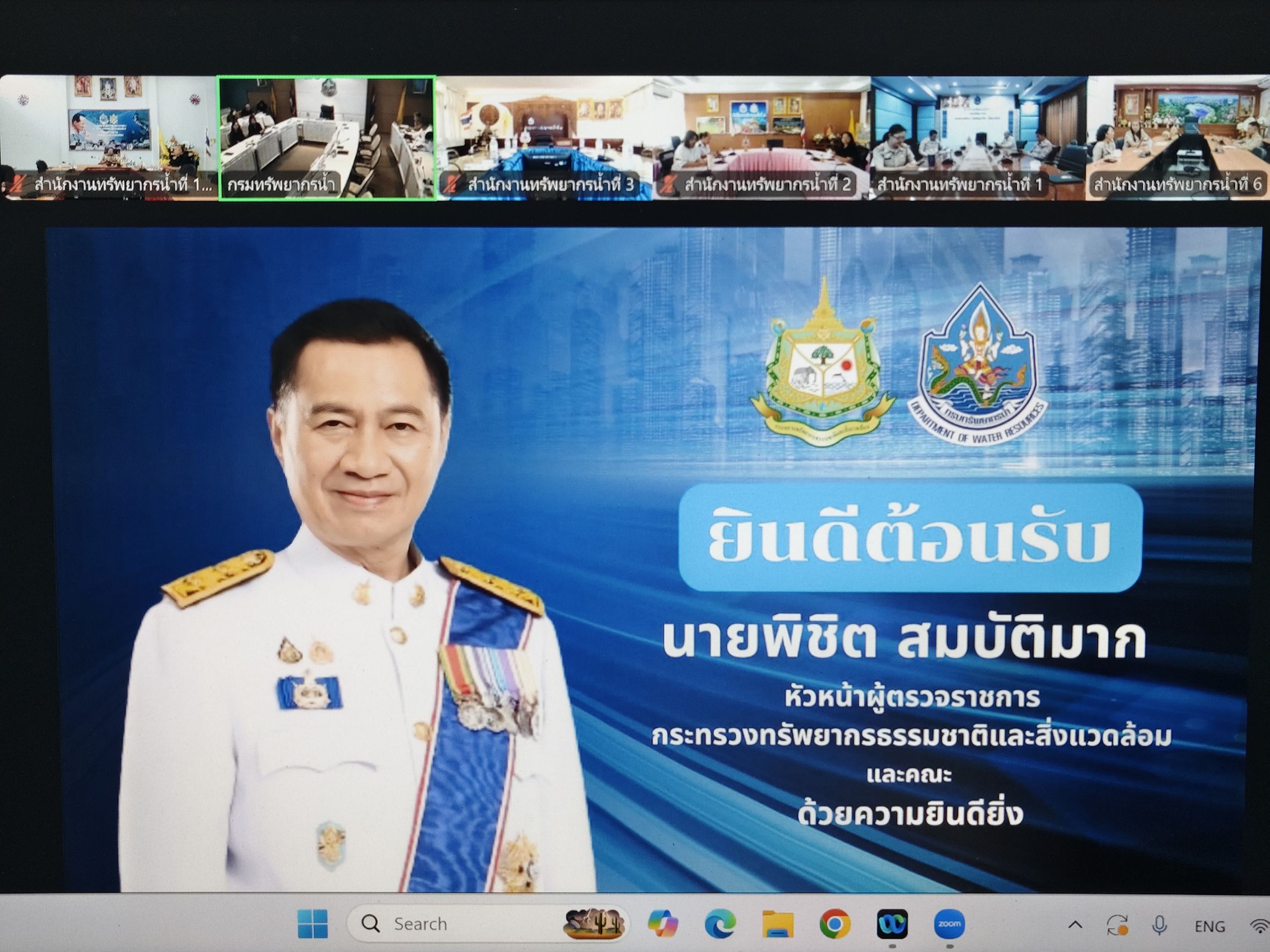 หัวหน้าผู้ตรวจราชการกระทรวงทรัพยากรธรรมชาติและสิ่งแวดล้อม (นายพิชิต สมบัติมาก) ได้กำหนดตรวจราชการกรมทรัพยากรน้ำ ประจำปี พ.ศ. 2569 เพื่อให้การติดตามการดำเนินงานตามภารกิจเป็นไปด้วยความเรียบร้อย ตามประเด็นการตรวจราชการที่เกี่ยวข้อง โดยมีนายโภคิน ช้ำเกตุ ผู้อำนวยการสำนักงานทรัพยากรน้ำที่ 11 คณะผู้บริหาร เข้าร่วมประชุมตรวจราชการในครั้งนี้ ผ่านระบบ Zoom ณ ห้องประชุมสำนักงานทรัพยากรน้ำที่ 11