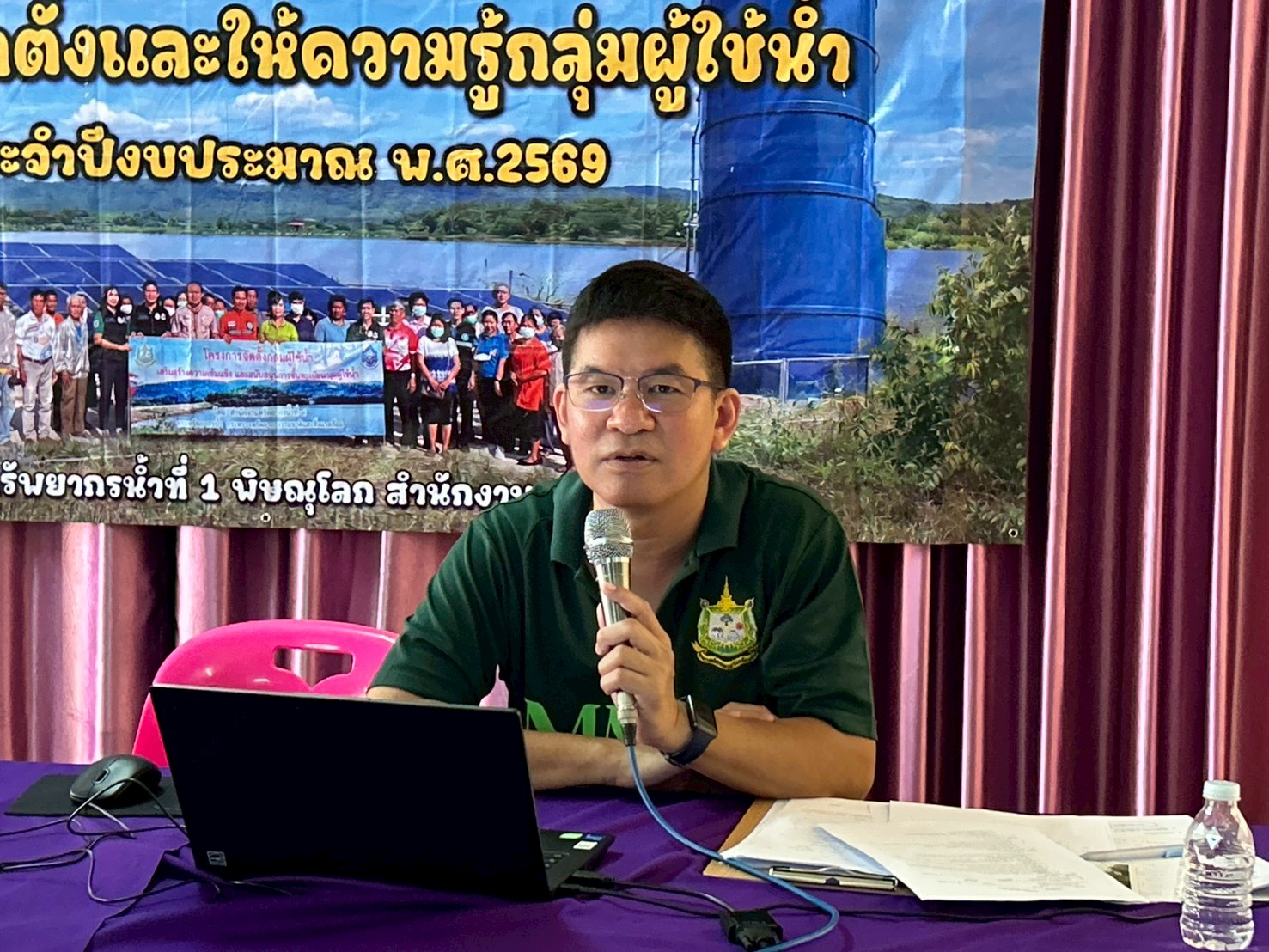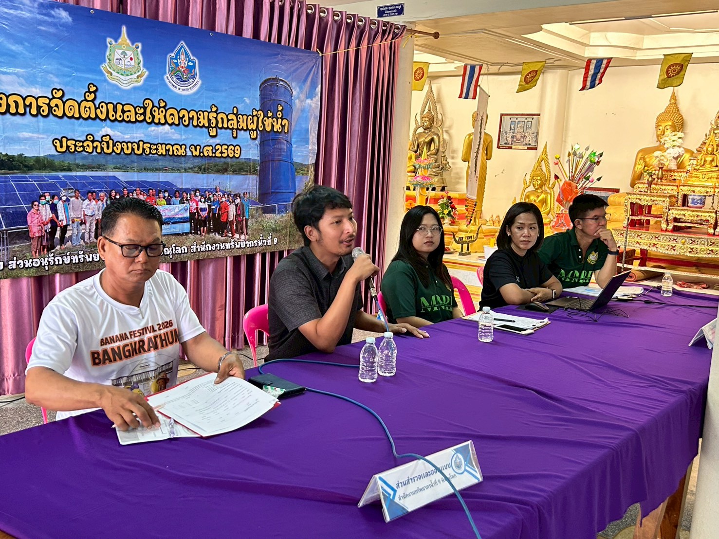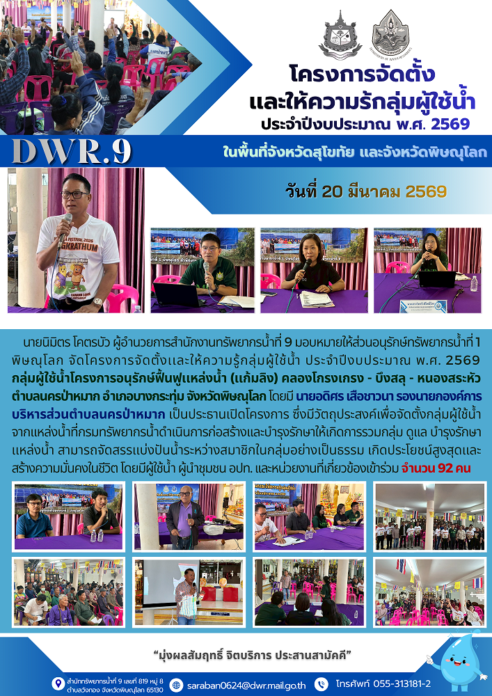 โครงการจัดตั้งเเละให้ความร้กลุ่มผู้ใช้น้ำ ประจำปีงบประมาณ พ.ศ. 2569 ในพื้นที่จังหวัดสุโขทัย เเละจังหวัดพิษณุโลก วันที่ 20 มีนาคม 2569 นายนิมิตร โคตรบัว ผู้อำนวยการสำนักงานทรัพยากรน้ำที่ 9 มอบหมายให้ส่วนอนุรักษ์ทรัพยากรน้ำที่ 1 พิษณุโลก จัดโครงการจัดตั้งเเละให้ความรู้กลุ่มผู้ใช้น้ำ ประจำปีงบประมาณ พ.ศ. 2569 กลุ่มผู้ใช้น้ำโครงการอนุรักษ์ฟื้นฟูเเหล่งน้ำ (เเก้มลิง) คลองโกรงเกรง - บึงสลุ - หนองสระหัว ตำบลนครป่าหมาก อำเภอบางกระทุ่ม จังหวัดพิษณุโลก โดยมีนายอดิศร เสือชาวนา รองนายกองค์การบริหารส่วนตำบลนครป่าหมาก เป็นประธานเปิดโครงการ ซึ่งมีวัตถุประสงค์เพื่อจัดตั้งกลุ่มผู้ใช้น้ำ จากเเหล่งน้ำที่กรมทรัพยากรน้ำดำเนินการก่อสร้างเเละบำรุงรักษาให้เกิดการรวมกลุ่ม ดูเเล บำรุงรักษา เเหล่งน้ำ สามารถจัดสรรเเบ่งปันน้ำระหว่างสมาชิกในกลุ่มอย่างเป็นธรรม เกิดประโยชน์สูงสุดเเละสร้างความมั่นคงในชีวิต โดยมีผู้ใช้น้ำ ผู้นำชุมชน อปท. เเละหน่วยงานที่เกี่ยวข้องเข้าร่วม จำนวน 92 คน