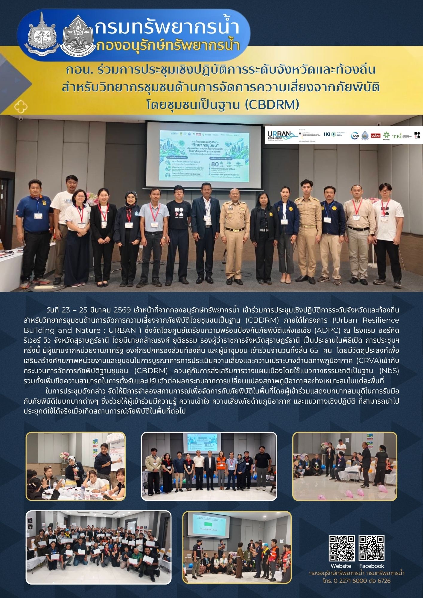 วันที่ 23 – 25 มีนาคม 2569 เจ้าหน้าที่จากกองอนุรักษ์ทรัพยากรน้ำ เข้าร่วมการประชุมเชิงปฏิบัติการระดับจังหวัดและท้องถิ่นสำหรับวิทยากรชุมชนด้านการจัดการความเสี่ยงจากภัยพิบัติโดยชุมชนเป็นฐาน (CBDRM) ภายใต้โครงการ (Urban Resilience Building and Nature : URBAN ) ซึ่งจัดโดยศูนย์เตรียมความพร้อมป้องกันภัยพิบัติแห่งเอเชีย (ADPC) ณ โรงแรม ออร์คิด ริเวอร์ วิว จังหวัดสุราษฎร์ธานี โดยมีนายกล้าณรงค์ ยุติธรรม รองผู้ว่าราชการจังหวัดสุราษฎร์ธานี เป็นประธานในพิธีเปิด การประชุมฯ ครั้งนี้ มีผู้แทนจากหน่วยงานภาครัฐ องค์กรปกครองส่วนท้องถิ่น และผู้นำชุมชน เข้าร่วมจำนวนทั้งสิ้น 65 คน โดยมีวัตถุประสงค์เพื่อเสริมสร้างศักยภาพหน่วยงานและชุมชนในการบูรณาการการประเมินความเสี่ยงและความเปราะบางด้านสภาพภูมิอากาศ (CRVA)เข้ากับกระบวนการจัดการภัยพิบัติฐานชุมชน (CBDRM) ควบคู่กับการส่งเสริมการวางแผนเมืองโดยใช้แนวทางธรรมชาติเป็นฐาน (NbS) รวมทั้งเพิ่มขีดความสามารถในการตั้งรับและปรับตัวต่อผลกระทบจากการเปลี่ยนแปลงสภาพภูมิอากาศอย่างเหมาะสมในแต่ละพื้นที่