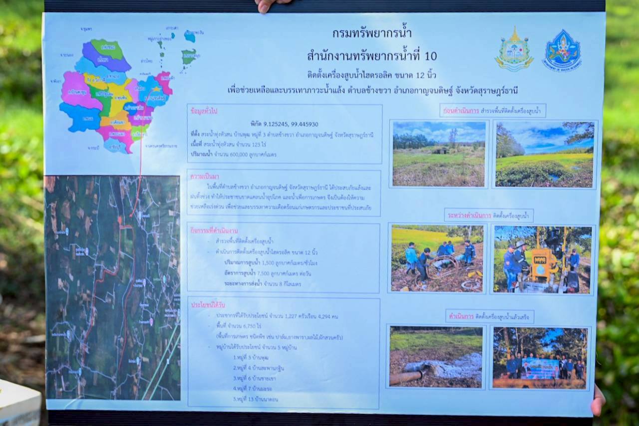 นายพงศ์พัฒน์ เสมอคำ รองอธิบดีกรมทรัพยากรน้ำ ลงพื้นที่จังหวัดสุราษฎร์ธานี เพื่อติดตามความก้าวหน้าการดำเนินงานโครงการพัฒนาแหล่งน้ำและการจัดหาน้ำเพื่อการอุปโภคบริโภคของประชาชนและสถานศึกษาในพื้นที่ โดยมี นายดุลยธรรม ทวิชสังข์ ผู้อำนวยการสำนักงานทรัพยากรน้ำที่ 10 พร้อมด้วยเจ้าหน้าที่และหน่วยงานที่เกี่ยวข้อง ร่วมรายงานผลการดำเนินงานโครงการติดตั้งเครื่องสูบน้ำไฮดรอลิคขนาด 12 นิ้ว เพื่อช่วยเหลือและบรรเทาภาวะน้ำแล้ง ในพื้นที่ตำบลช้างขวา อำเภอกาญจนดิษฐ์ จังหวัดสุราษฎร์ธานี ซึ่งเป็นการเพิ่มศักยภาพในการบริหารจัดการน้ำให้สามารถส่งน้ำไปยังพื้นที่การเกษตรและชุมชนได้อย่างมีประสิทธิภาพ ช่วยบรรเทาปัญหาการขาดแคลนน้ำในช่วงฤดูแล้ง และติดตามความก้าวหน้า