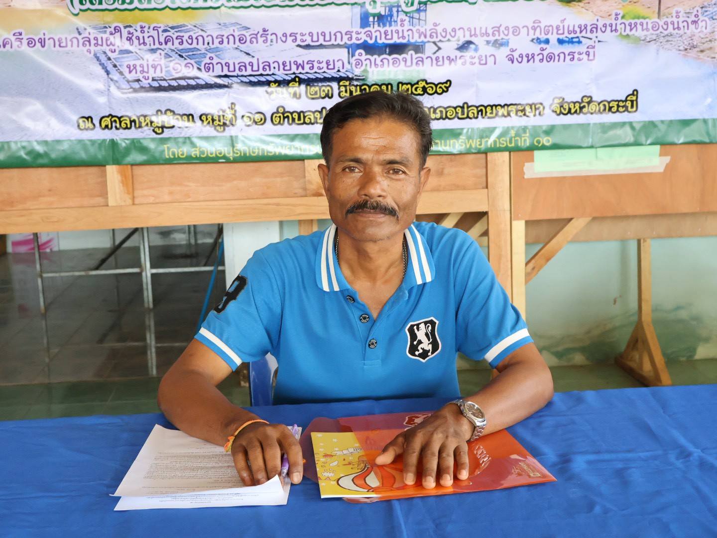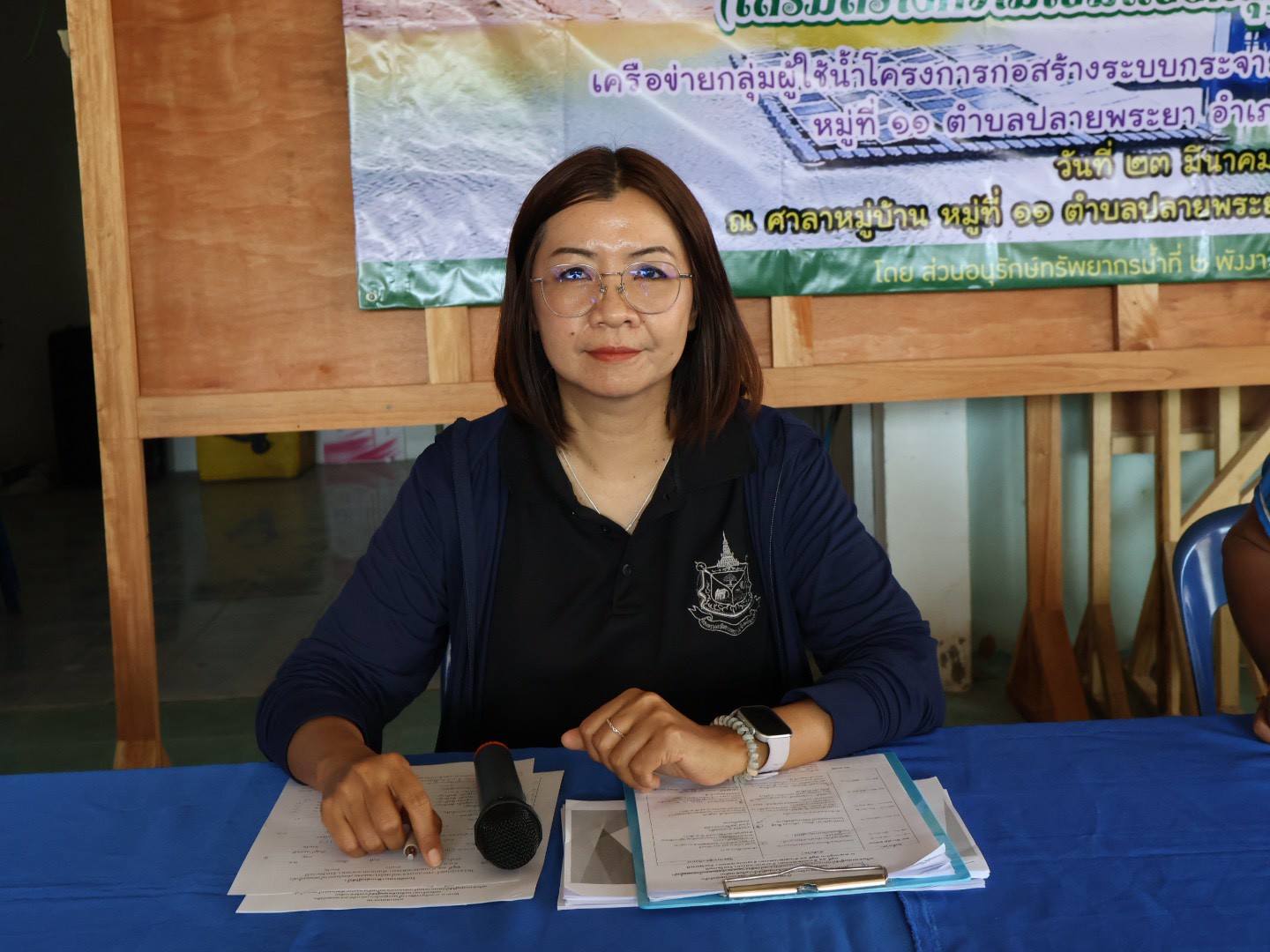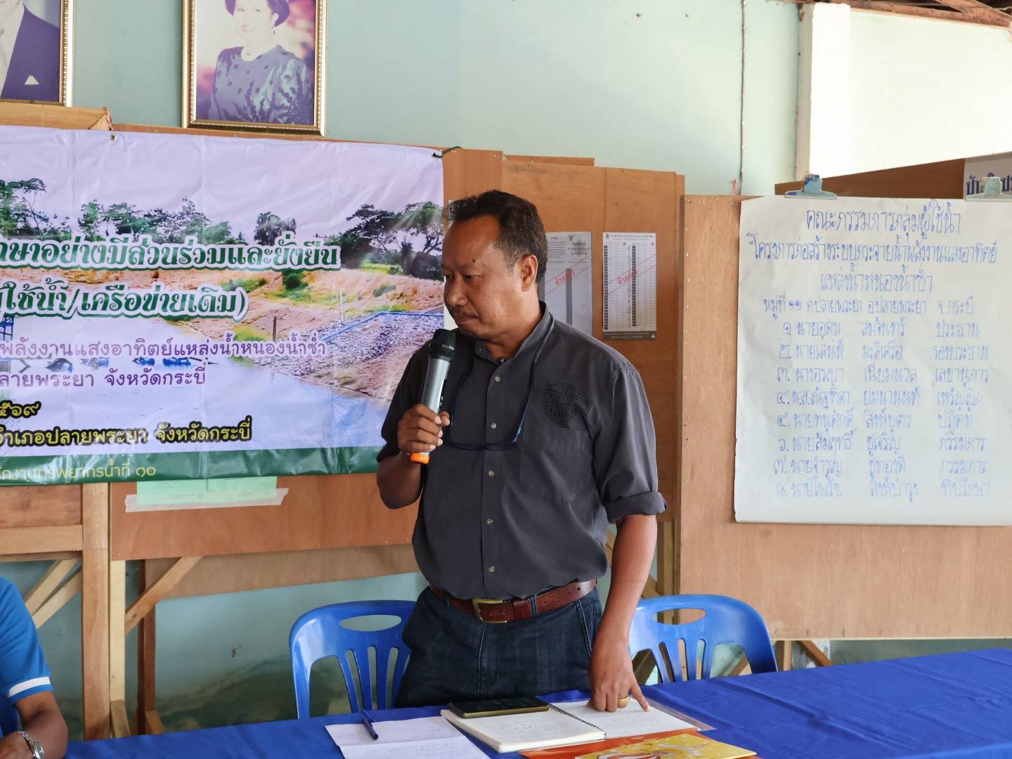 สำนักงานทรัพยากรน้ำที่ 10 โดยส่วนอนุรักษ์ทรัพยากรน้ำที่ 2 พังงา ดำเนิน “โครงการ การบริหารจัดการน้ำและการดูแลรักษาอย่างมีส่วนร่วมและยั่งยืน (เสริมสร้างความเข้มแข็งกลุ่มผู้ใช้น้ำ/เครือข่ายเดิม)” เครือข่ายกลุ่มผู้ใช้น้ำ โครงการก่อสร้างระบบกระจายน้ำพลังงานแสงอาทิตย์แหล่งน้ำหนองน้ำซ่ำ ตำบลปลายพระยา อำเภอปลายพระยา จังหวัดกระบี่ ณ ศาลาหมู่บ้าน หมู่ที่ 11 ตำบลปลายพระยา อำเภอปลายพระยา จังหวัดกระบี่ ผู้เข้าร่วมโครงการฯ ประกอบด้วย กลุ่มผู้ใช้น้ำ/เครือข่ายเดิมที่ได้จัดตั้งไว้ ประชาชน ผู้นำชุมชน ผู้นำองค์กรปกครองส่วนท้องถิ่น จำนวน 60 คน