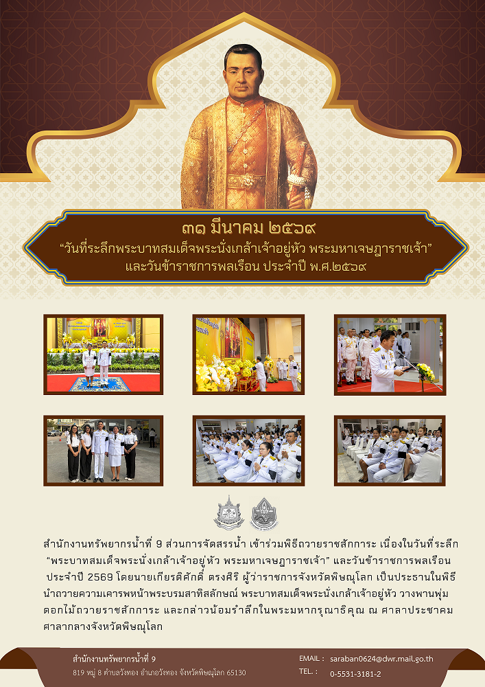 สำนักงานทรัพยากรน้ำที่ 9 ส่วนการจัดสรรน้ำ เข้าร่วมพิธีถวายราชสักการะ เนื่องในวันที่ระลึก “พระบาทสมเด็จพระนั่งเกล้าเจ้าอยู่หัว พระมหาเจษฎาราชเจ้า” และวันข้าราชการพลเรือน ประจำปี 2569 โดยนายเกียรติศักดิ์ ตรงศิริ ผู้ว่าราชการจังหวัดพิษณุโลก เป็นประธานในพิธี นำถวายความเคารพหน้าพระบรมสาทิสลักษณ์ พระบาทสมเด็จพระนั่งเกล้าเจ้าอยู่หัว วางพานพุ่มดอกไม้ถวายราชสักการะ และกล่าวน้อมรำลึกในพระมหากรุณาธิคุณ ณ ศาลาประชาคม ศาลากลางจังหวัดพิษณุโลก