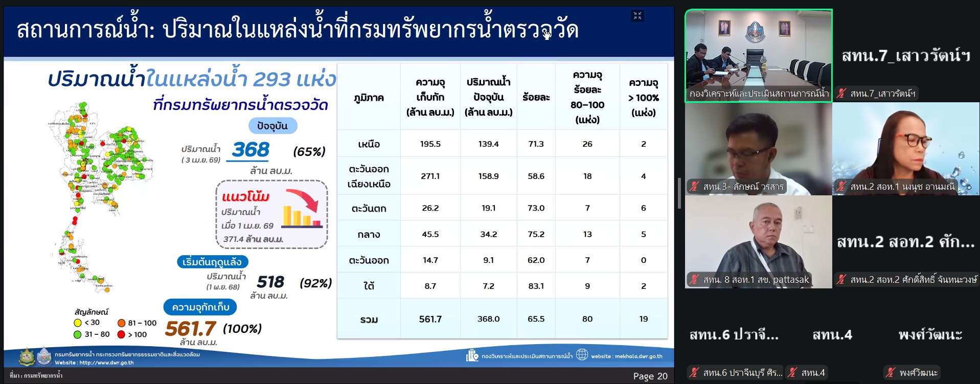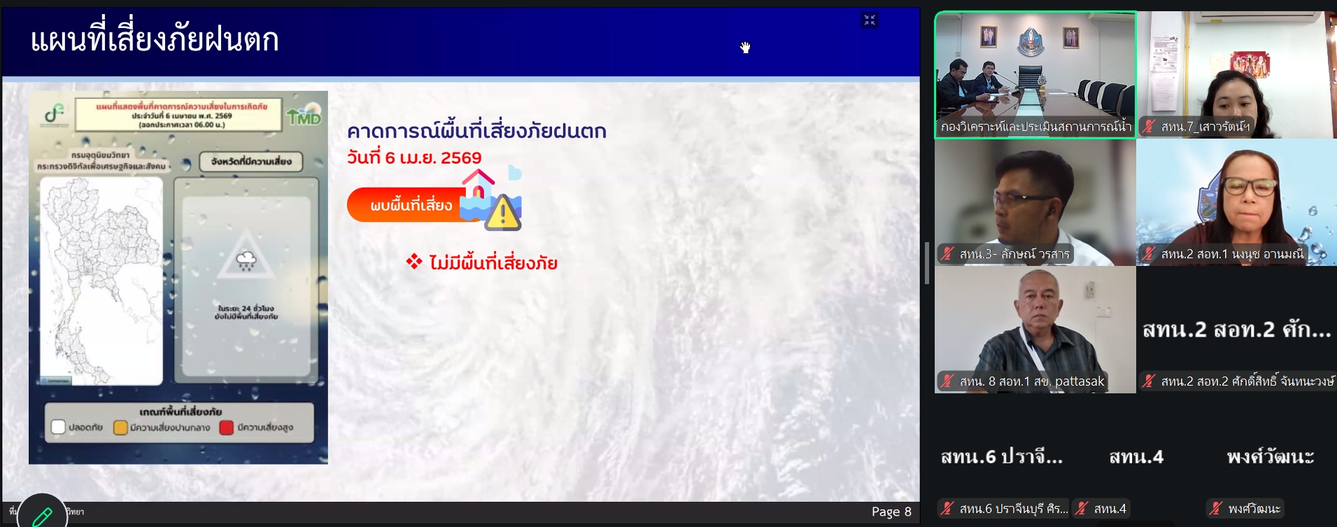 วันที่ 7 เมษายน 2569 นายอนันต์ โพธิ์พันธุ์ ผู้อำนวยการสำนักงานทรัพยากรน้ำที่ 7 มอบหมายให้ส่วนเครื่องกล และส่วนอุทกวิทยา เข้าร่วมประชุมคณะทำงานด้านการประเมินสถานการณ์น้ำและการบริหารจัดการน้ำ ครั้งที่ 6/2569 ผ่านสื่ออิเล็กทรอนิกส์ระบบ ZOOM โดยมีนายยิ่งยง ลิคะสิริ ผู้อำนวยการส่วนประสานการปฏิบัติงานในภาวะน้ำท่วม เป็นประธานการประชุม เพื่อรายงานสถานการณ์น้ำ การเตรียมพร้อมรับมือและการให้ความช่วยเหลือพื้นที่ภัยแล้งและน้ำท่วม
