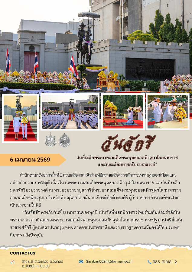 สำนักงานทรัพยากรน้ำที่ 9 ส่วนเครื่องกล เข้าร่วมพิธีถวายเครื่องราชสักการะพานพุ่มดอกไม้สด และกล่าวคำถวายราชสดุดี เนื่องในวันพระบาทสมเด็จพระพุทธยอดฟ้าจุฬาโลกมหาราช และวันที่ระลึกมหาจักรีบรมราชวงศ์ ณ พระบรมราชานุสาวรีย์พระบาทสมเด็จพระพุทธยอดฟ้าจุฬาโลกมหาราช อำเภอเมืองพิษณุโลก จังหวัดพิษณุโลก โดยมีนายเกียรติศักดิ์ ตรงศิริ ผู้ว่าราชการจังหวัดพิษณุโลก เป็นประธานในพิธี “วันจักรี” ตรงกับวันที่ 6 เมษายนของทุกปี เป็นวันที่พสกนิกรชาวไทยร่วมกันน้อมรำลึกในพระมหากรุณาธิคุณของพระบาทสมเด็จพระพุทธยอดฟ้าจุฬาโลกมหาราช พระปฐมกษัตริย์แห่งราชวงศ์จักรี ผู้ทรงสถาปนากรุงเทพมหานครเป็นราชธานี และวางรากฐานความมั่นคงให้กับประเทศสืบมาจนถึงปัจจุบัน