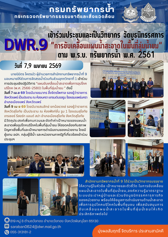 นายนิมิตร โคตรบัว ผู้อำนวยการสำนักงานทรัพยากรน้ำที่ 9 มอบหมายให้ส่วนการจัดสรรน้ำร่วมกับส่วนอุทกวิทยาที่ 1 เข้าร่วมการประชุมเชิงปฏิบัติการ “แผนขับเคลื่อนน้ำสะอาดเพื่อการอุปโภคบริโภค (พ.ศ. 2566–2580) ในพื้นที่ลุ่มน้ำยม ” ดังนี้วันที่ 7 เม.ย 69 โดยมีนายธนากร อึ้งจิตรไพศาล รองผู้ว่าราชการจังหวัดแพร่ เป็นประธาน ณ ห้องนครา แกรนด์บอลรูม โรงแรมแพร่นครา อำเภอเมืองแพร่ จังหวัดแพร่