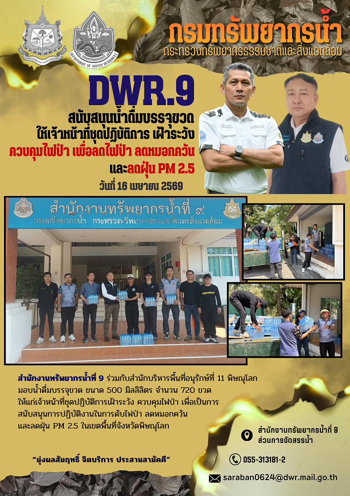 สำนักงานทรัพยากรน้ำที่ 9 ร่วมกับสำนักบริหารพื้นที่อนุรักษ์ที่ 11 พิษณุโลก มอบน้ำดื่มบรรจุขวด ขนาด 500 มิลลิลิตร จำนวน 720 ขวด ให้แก่เจ้าหน้าที่ชุดปฏิบัติการเฝ้าระวัง ควบคุมไฟป่า เพื่อเป็นการสนับสนุนการปฏิบัติงานในการดับไฟป่า ลดหมอกควัน และลดฝุ่น PM 2.5 ในเขตพื้นที่จังหวัดพิษณุโลก