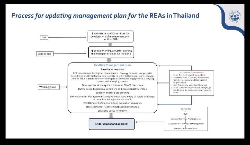 โดยในที่ประชุมกรมทรัพยากรน้ำได้พิจารณาจะดำเนินกิจกรรมเพื่อปรับปรุงแผนการบริหารจัดการพื้นที่ REAs ในส่วนของแม่น้ำสงครามตอนล่าง ในปี 2026 โดยการสนับสนุนงบประมาณจากMRC นอกจากนี้ที่ประชุมเห็นควรให้มีการบูรณาการหน่วยงานที่เกี่ยวข้องเพื่อจัดทำแผนการบริหารจัดการพื้นที่REAsในระดับลุ่มน้ำ(Basin-wide Management Plan)ที่สอดคล้องกับการบริหารจัดการในระดับลุ่มน้ำโขง ต่อไป