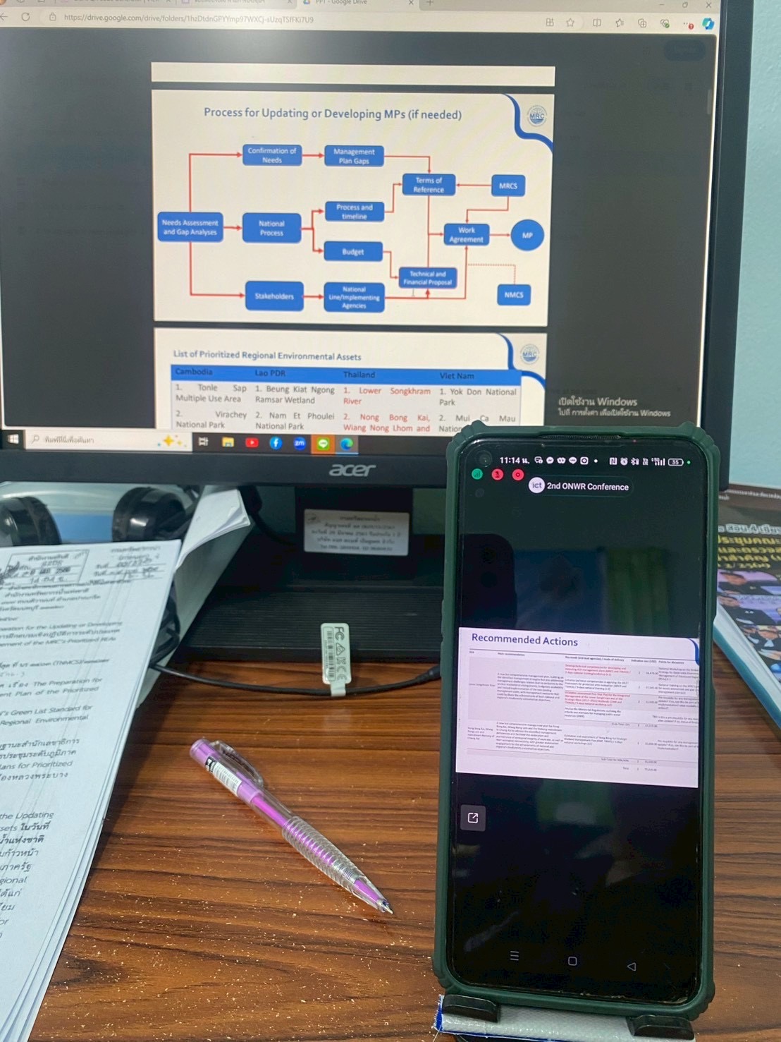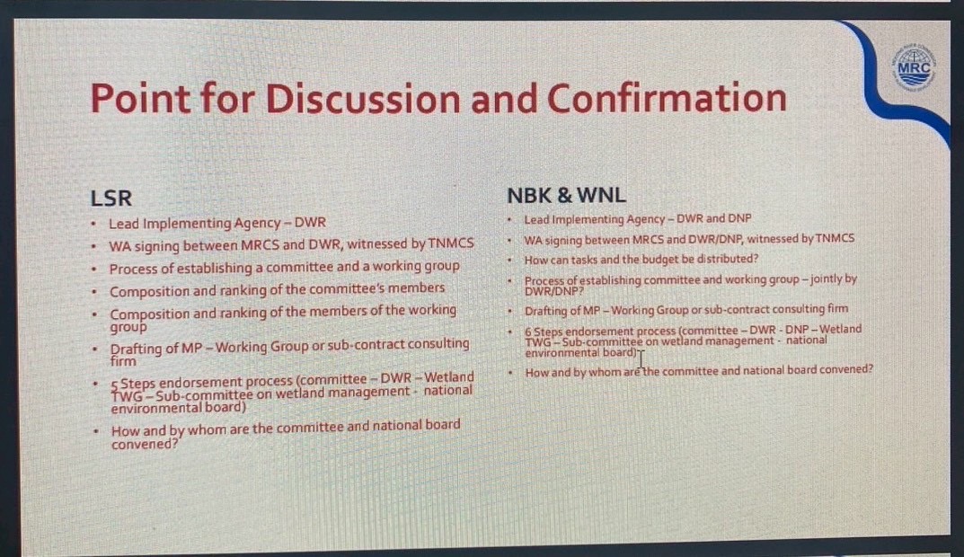 1.รายงานความก้าวหน้าการดำเนินงานของ MRCS ในการสนับสนุนประเทศสมาชิกMRC ในการจัดทำหรือปรับปรุงแผนการบริหารจัดการพื้นที่สินทรัพย์ทางสิ่งแวดล้อมในระดับลุ่มน้ำโขงตอนล่าง(REAs) โดยพื้นที่REAs ของประเทศไทยได้แก่ แม่น้ำสงครามตอนล่าง เขตห้ามล่าสัตว์ป่าหนองบงคาย-พื้นที่ชุ่มน้ำเวียงหนองหล่มและเพื่อเตรียมความพร้อมสำหรับการขอรับการสนับสนุนงบประมาณจากกองทุนแม่น้ำโขงด้านระบบนิเวศ