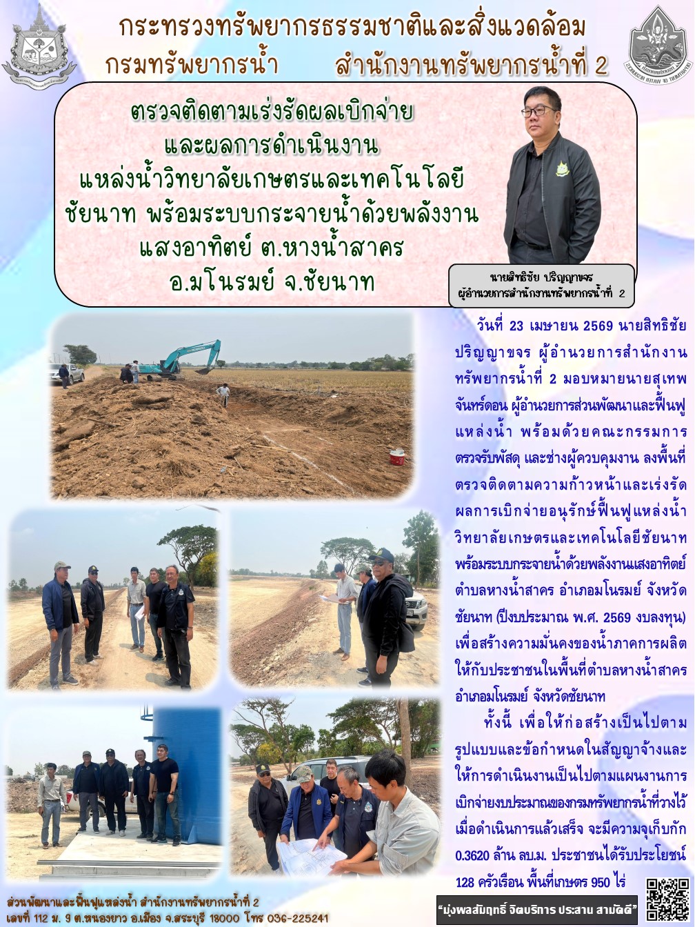 สำนักงานทรัพยากรน้ำที่ 2 ตรวจติดตามเร่งรัดผลเบิกจ่ายและผลการดำเนินงานแหล่งน้ำวิทยาลัยเกษตรและเทคโนโลยีชัยนาท พร้อมระบบกระจายน้ำด้วยพลังงานแสงอาทิตย์ ต.หางน้ำสาคร อ.มโนรมย์ จ.ชัยนาท