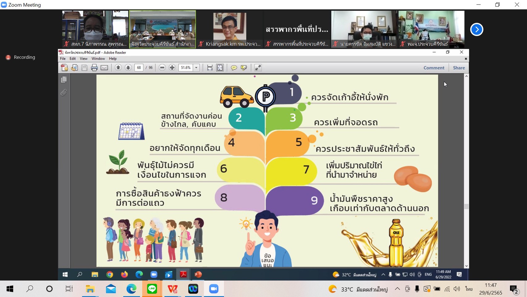 วันที่ 29 มิถุนายน 2565 นายเวสารัช โสภณดิเรกรัตน์ ผู้อำนวยการสำนักงานทรัพยากรน้ำ ภาค 7 มอบหมายให้ส่วนประสานและบริหารจัดการลุ่มน้ำเพชรบุรีและประจวบคีรีขันธ์ เข้าร่วมประชุมหัวหน้าส่วนราชการจังหวัดประจวบคีรีขันธ์ ประจำเดือนมิถุนายน 2565 โดยมี "นายพรหมพิริยะ กิจนุสนธิ์" รองผู้ว่าราชการจังหวัดประจวบคีรีขันธ์ เป็นประธาน การประชุม เพื่อรับทราบผลการดำเนินงานของหน่วยงานราชการในจังหวัดประจวบคีรีขันธ์ และแจ้งข้อมูลข่าวสารของจังหวัดให้ทราบ โดยผ่านระบบทางไกลออนไลน์ (ZOOM MEETING)